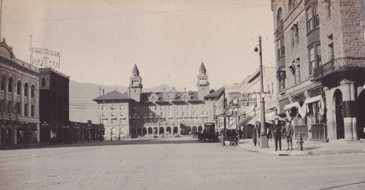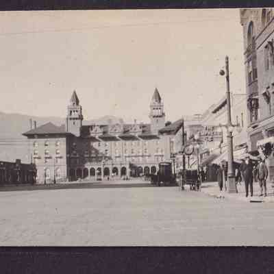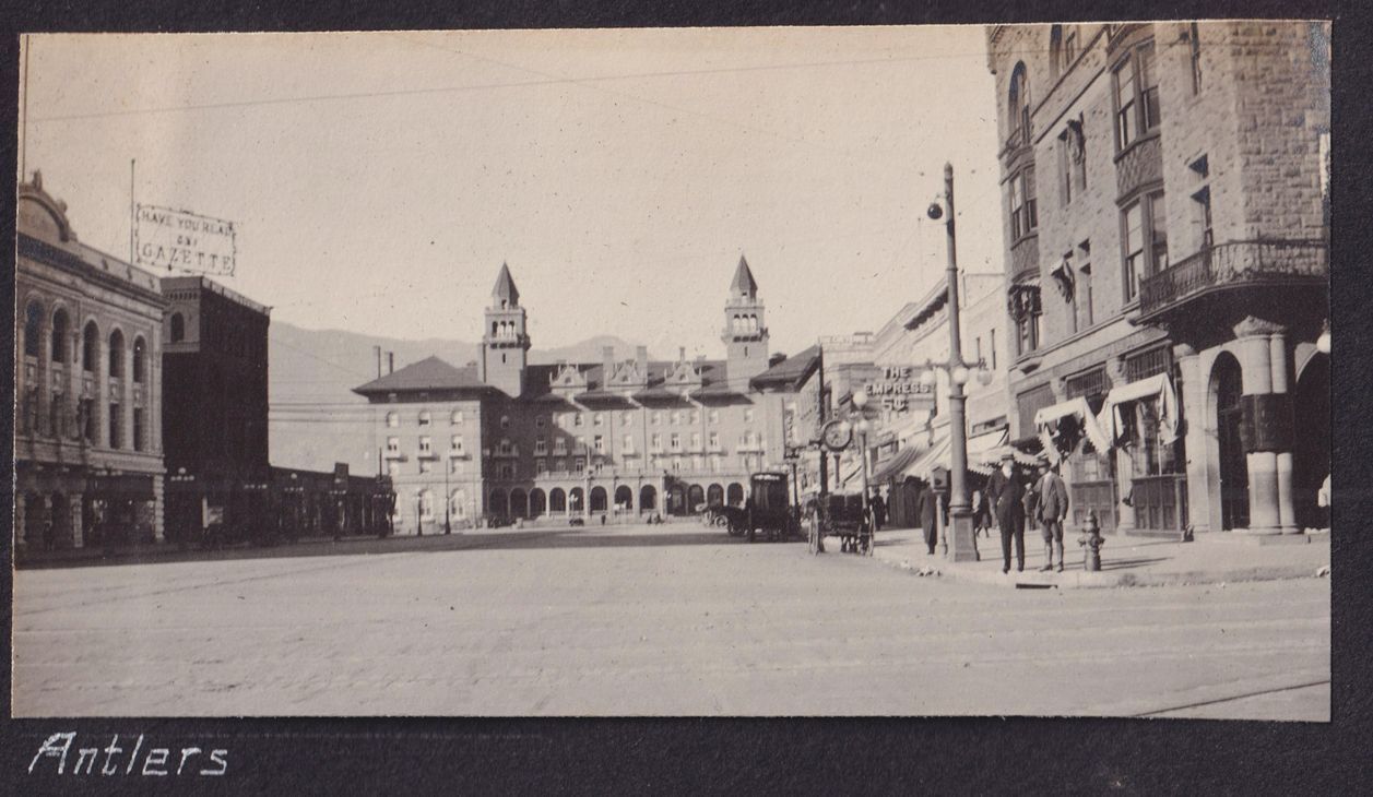 Black-and-white photograph of a city square, with the camera focused on a large building across the square, the Antlers Hotel in Colorado Springs, Colorado. Some of the buildings on the side have large signs on them or above them. "Antlers" is written below the photograph in white ink.
