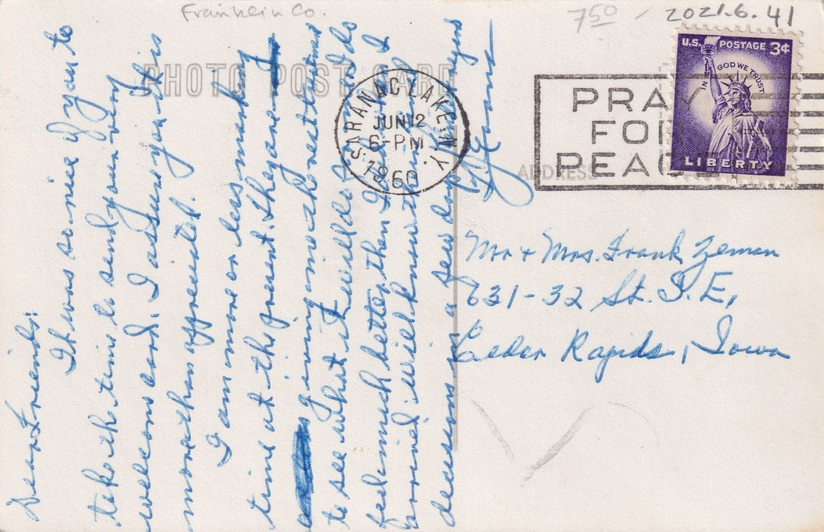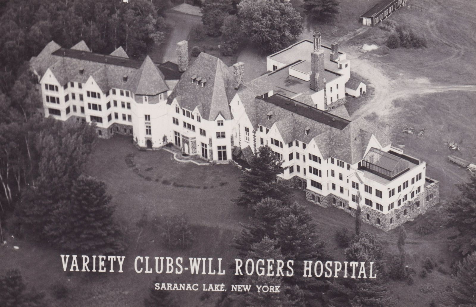 Black and white photo postcard of Will Rogers Hospital. The photograph is from an aerial angle and shows the building and grounds from above. The postcard has a Saranac Lake postmark on the back and is dated June 12, 1960.