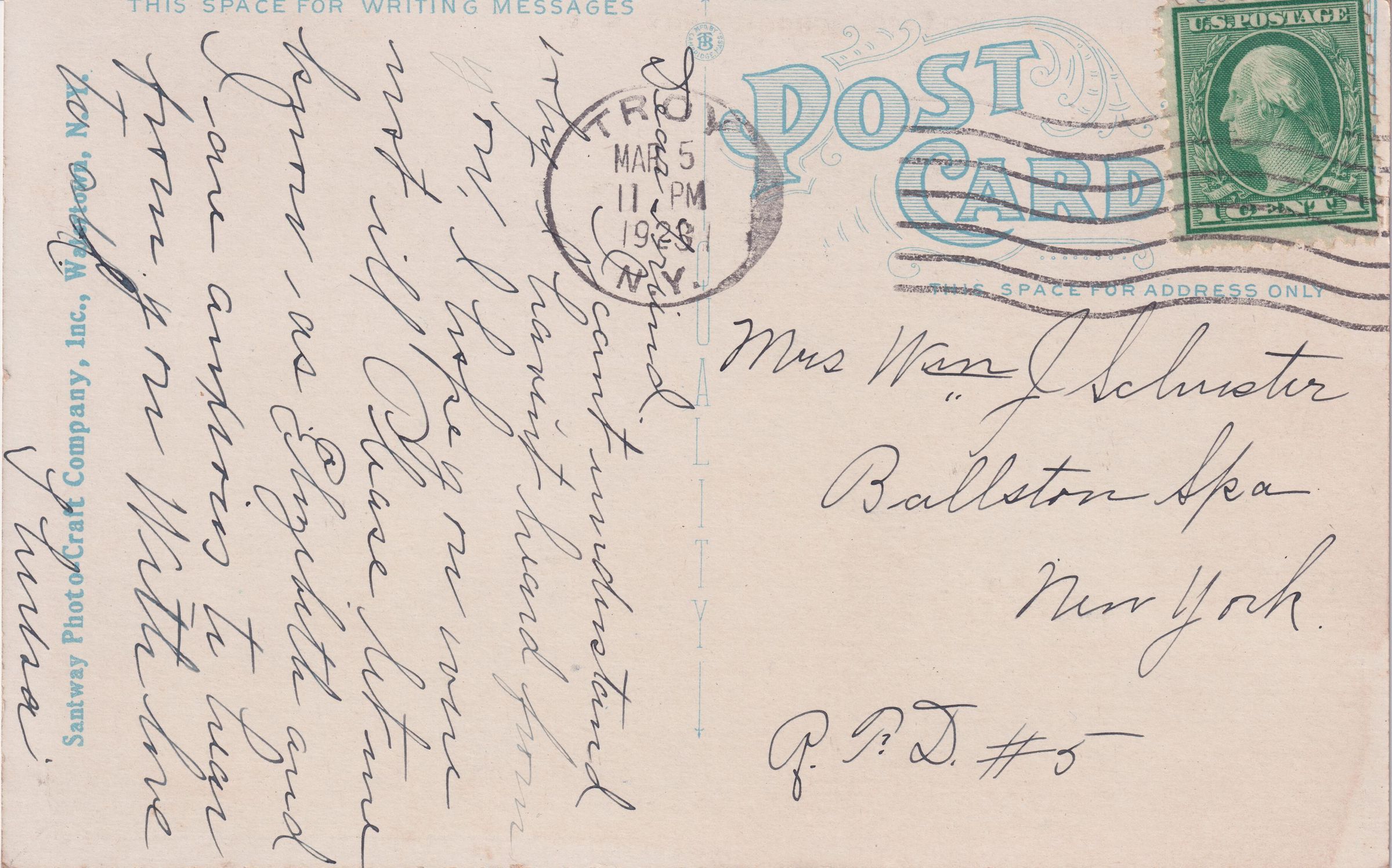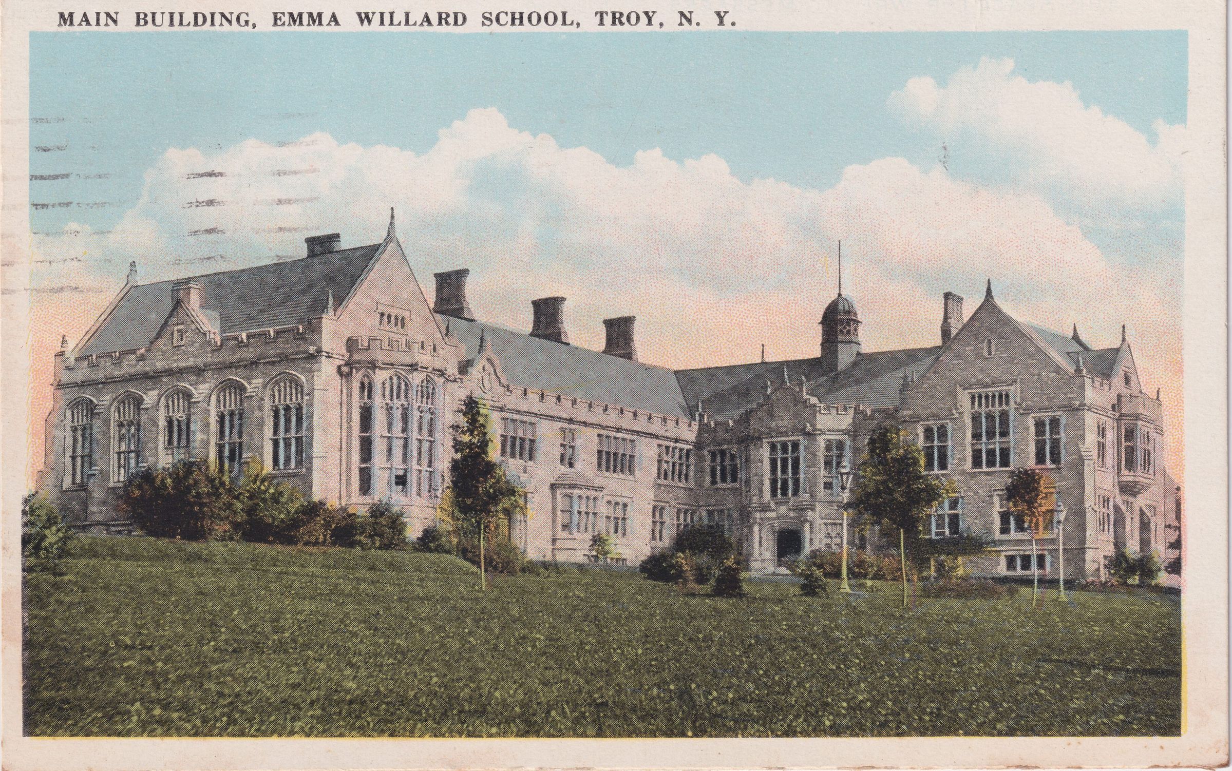 Postcard with image identified as "Main Building, Emma Willard School, Troy, N.Y." Message on back reads, "Dear Friend, I can't understand why I haven't heard from you. I hope you are not ill. Please let me know, as Elizabeth and I are anxious to hear from you. With love to all, Theresa." Addressed to, "Mrs. Wm. Schuster, Ballston Spa New York" and postmarked in Troy, NY.Collection