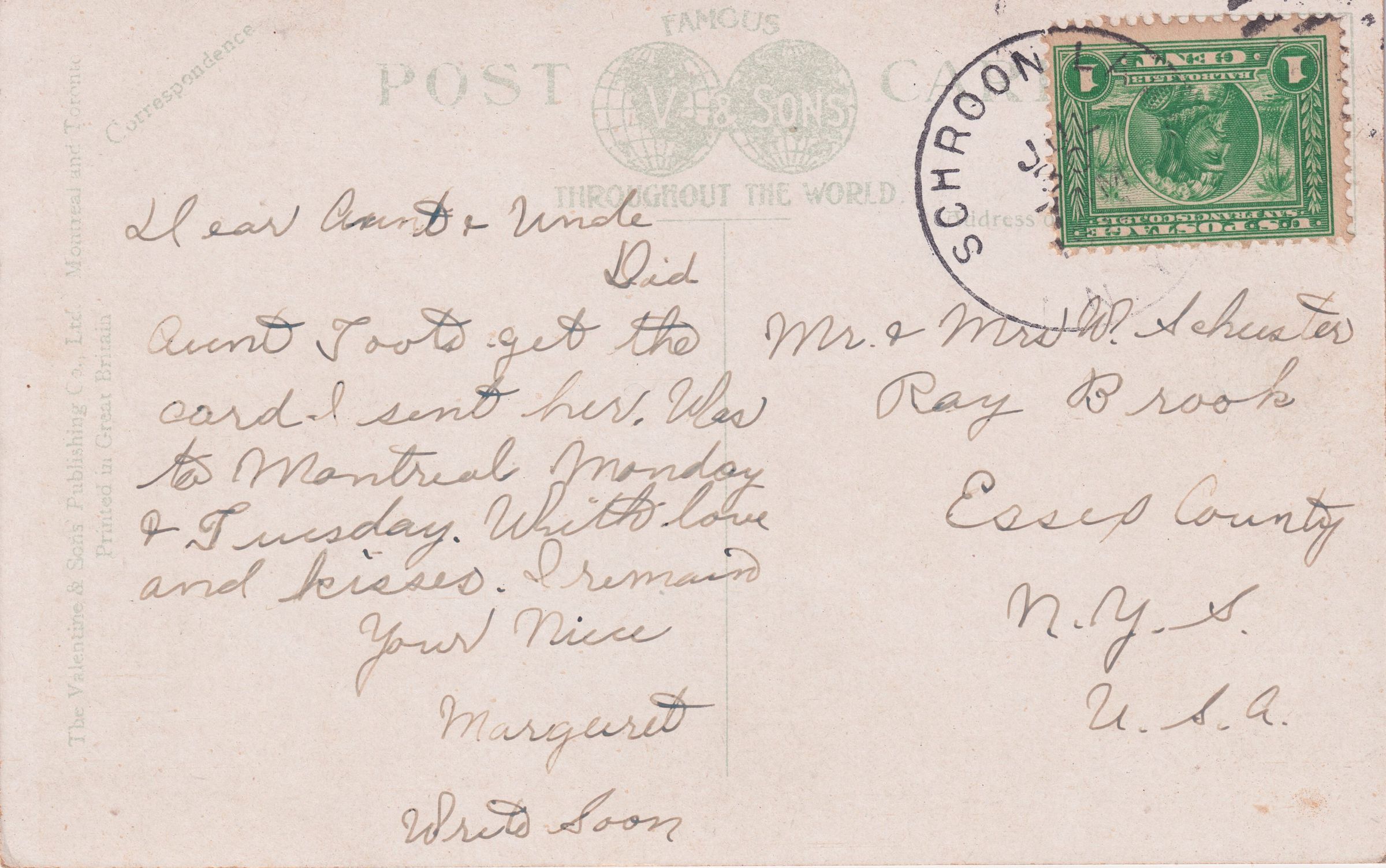 Postcard with image identified as "Le Gare Windsor, C.P.R., Montreal, Que." Message on back reads, "Dear Aunt and Uncle, Did Aunt Toots get the card I sent her. Went to Montreal Monday and Tuesday. With love and kisses I remain, your niece, Margaret. Write soon." Addressed to "Mr. and Mrs. W. Schuster, Ray Brook, Essex County, N.Y.S. U.S.A." and postmarked in Schroon, NY.Collection