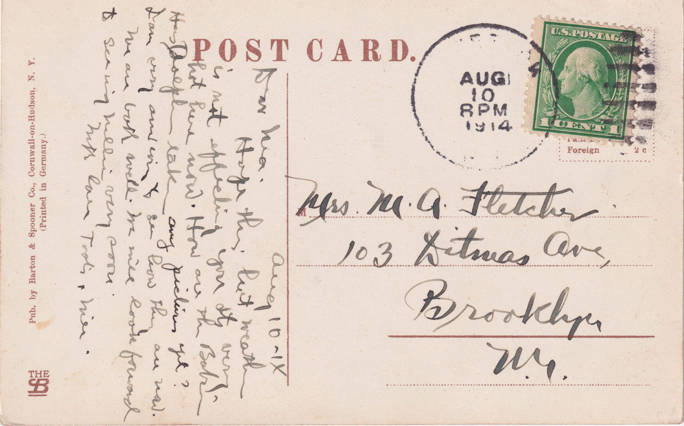 Postcard with image identified as "White Birch Drive, Saranac Inn, Upper Saranac Lake, Adirondacks." Message on back reads, "Dear Ma, Hope this hot weather is not effecting you. It's very hot here now. How are the babies has Joseph taken any pictures yet? I am very anxious to see how they are now. We are both well. We will look forward to seeing Willie very soon. With love, Toots and Will." Addressed to "Mrs. M.A. Fletcher, 103 Ditmas Ave, Brooklyn, N.Y."Subject Place