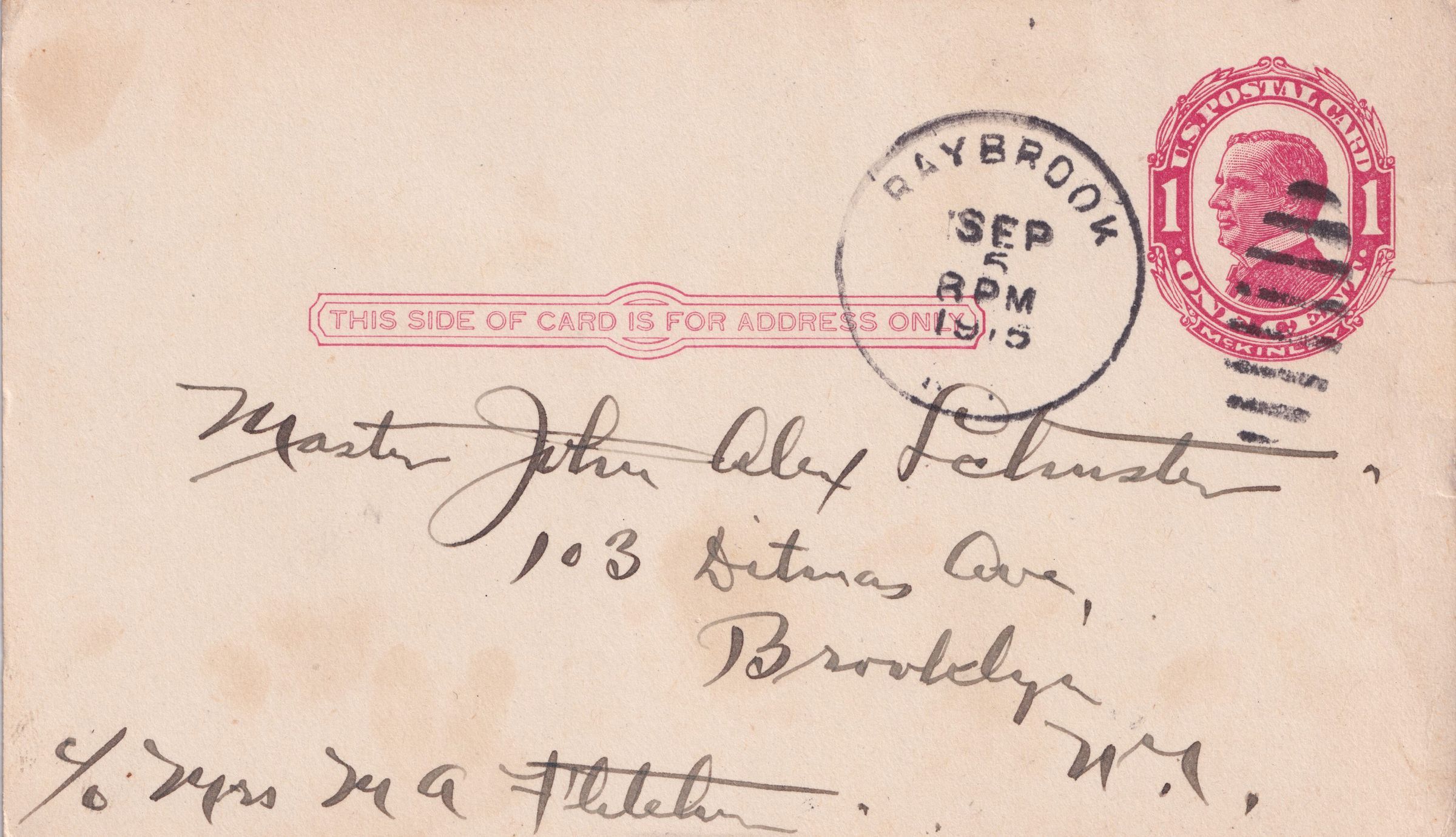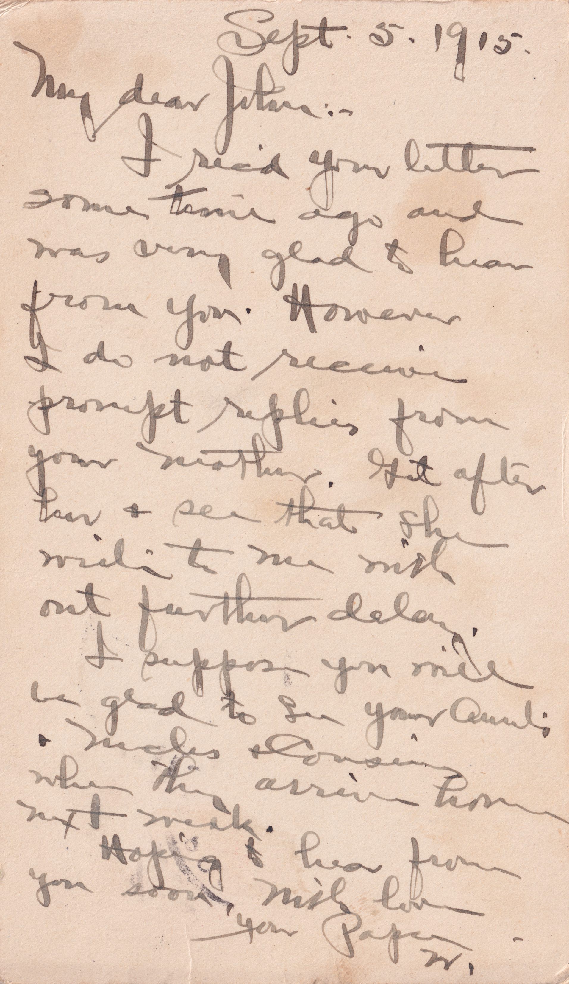 Postcard with blank front for message. Message reads, "Sept. 5, 1915. My dear John, I read your letter some time ago and was very glad to hear from you. However I do not receive prompt replies from your mother. Get after her and see that she writes to me without further delay. I suppose you will be glad to see your aunts and uncles and cousins when they arrive home next week. Hoping to hear from you soon. With love, your Papa W." Addressed to "Master John Alex Schuster, 103 Ditmas Ave, Brooklyn, NY c/o Mrs. M.A. Fletcher." Postmarked in Raybrook, NY.Collection