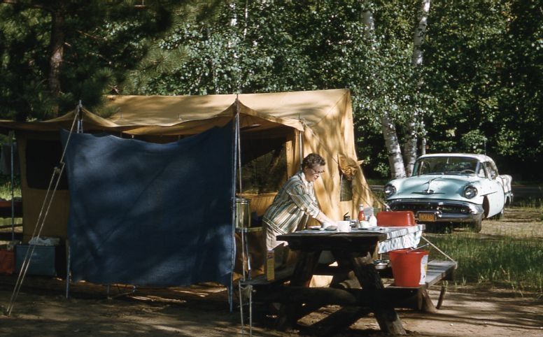 Color Kodachrome slide showing a woman at a picnic table. This item is not fully cataloged but has been uploaded so the image is publicly available; if you would like us to prioritize cataloging this item, please contact the HSL Collections team.