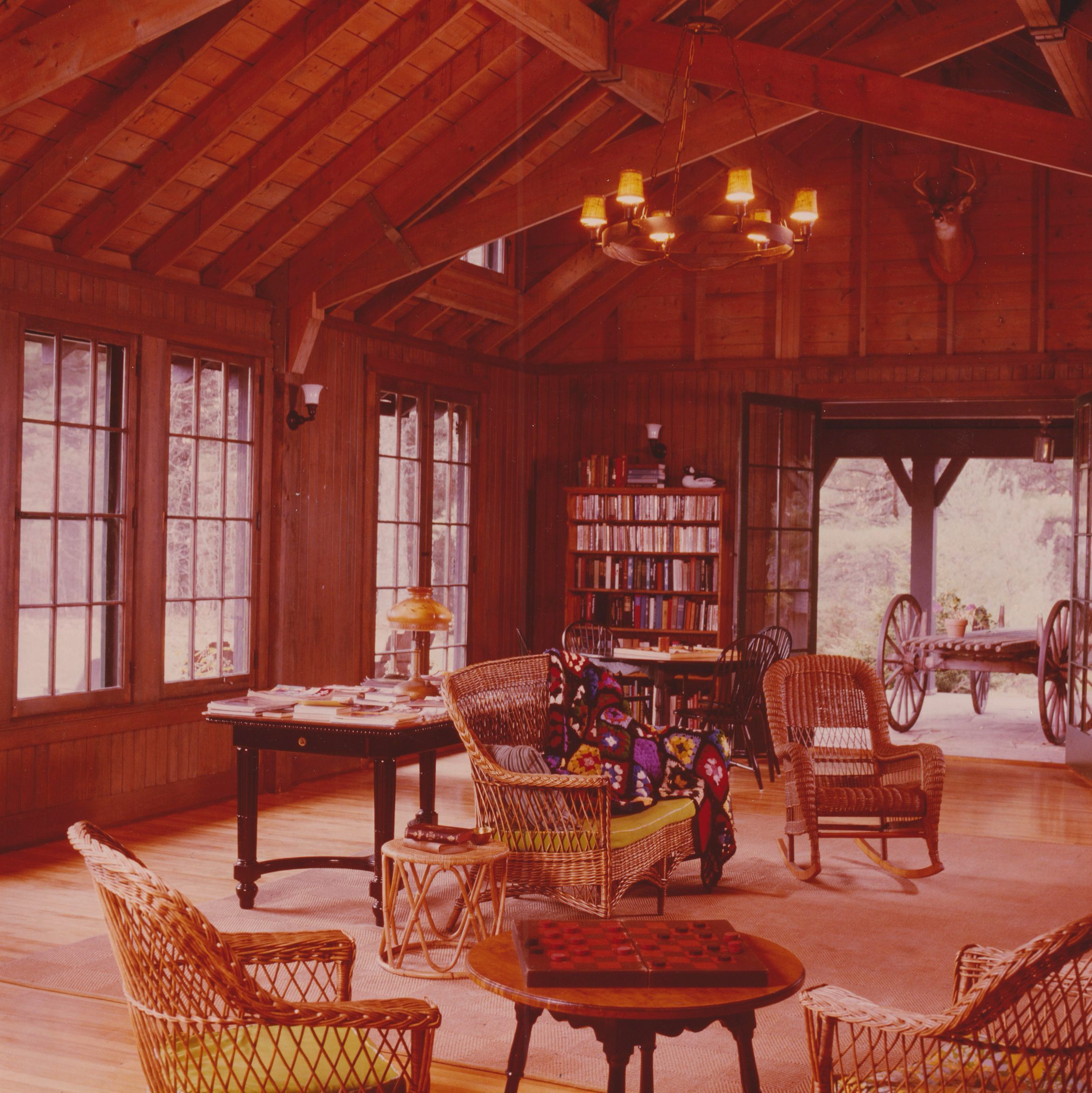 Color photograph showing a large living room or great room in an unidentified cottage at Bartlett Carry Club.