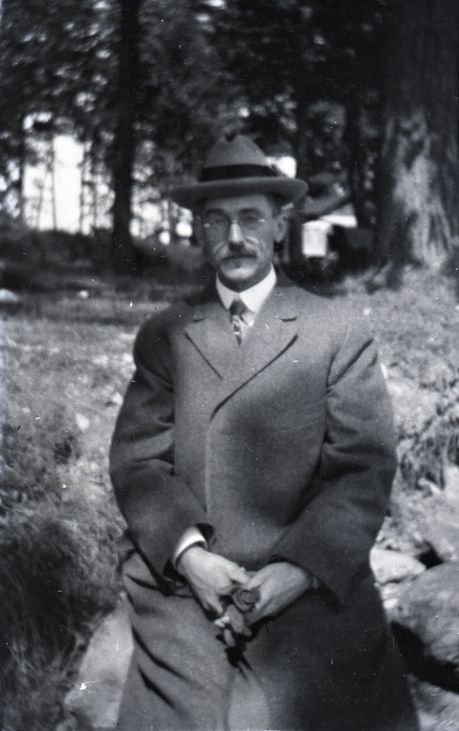 Negative of Dr. Edward R. Baldwin sitting outside on a rock. He is wearing a thick jacket, brimmed hat, and holding gloves. Most likely taken by Mary Ives Baldwin. This item is not fully cataloged but has been uploaded so the image is publicly available; if you would like us to prioritize cataloging this item, please contact the HSL Collections team.