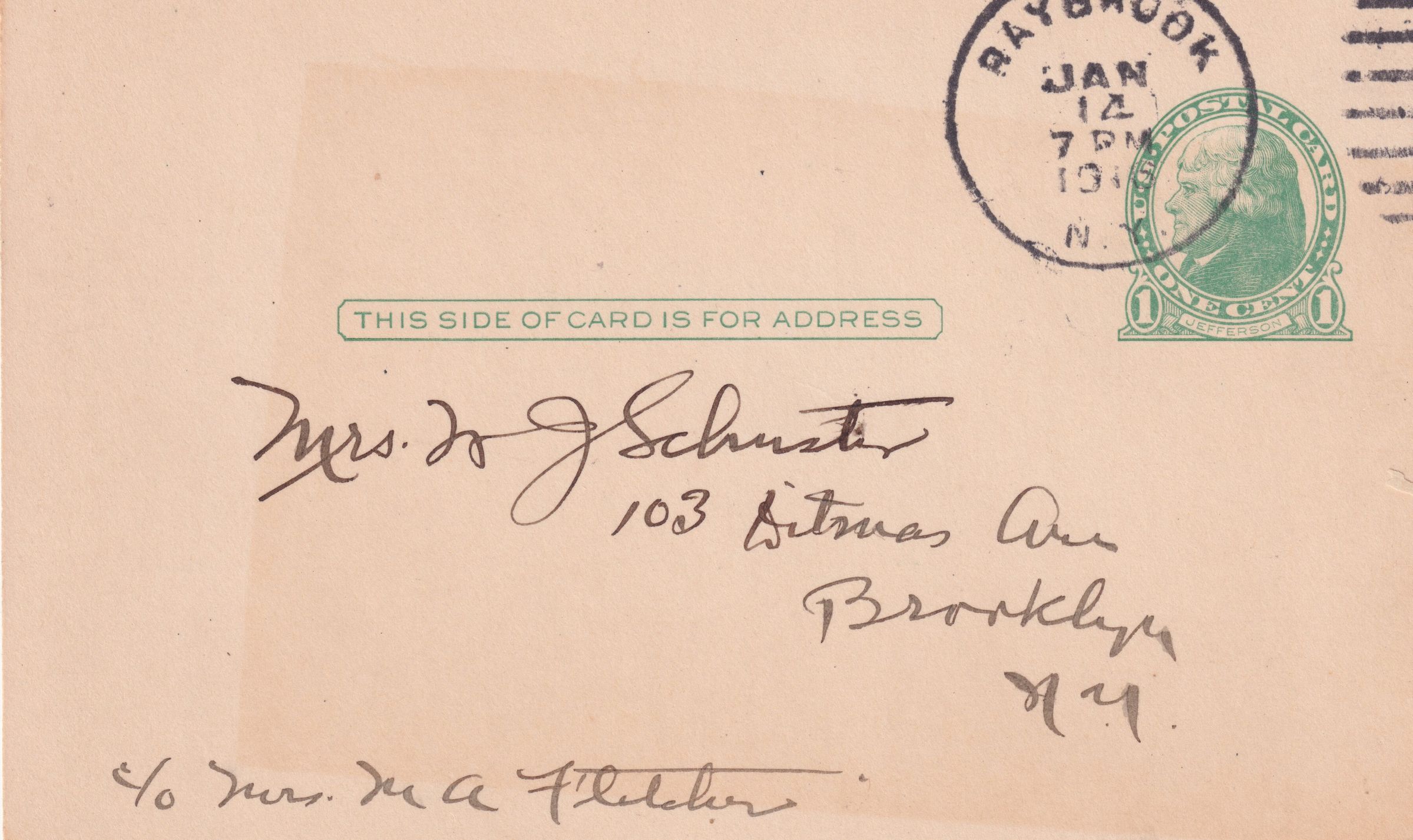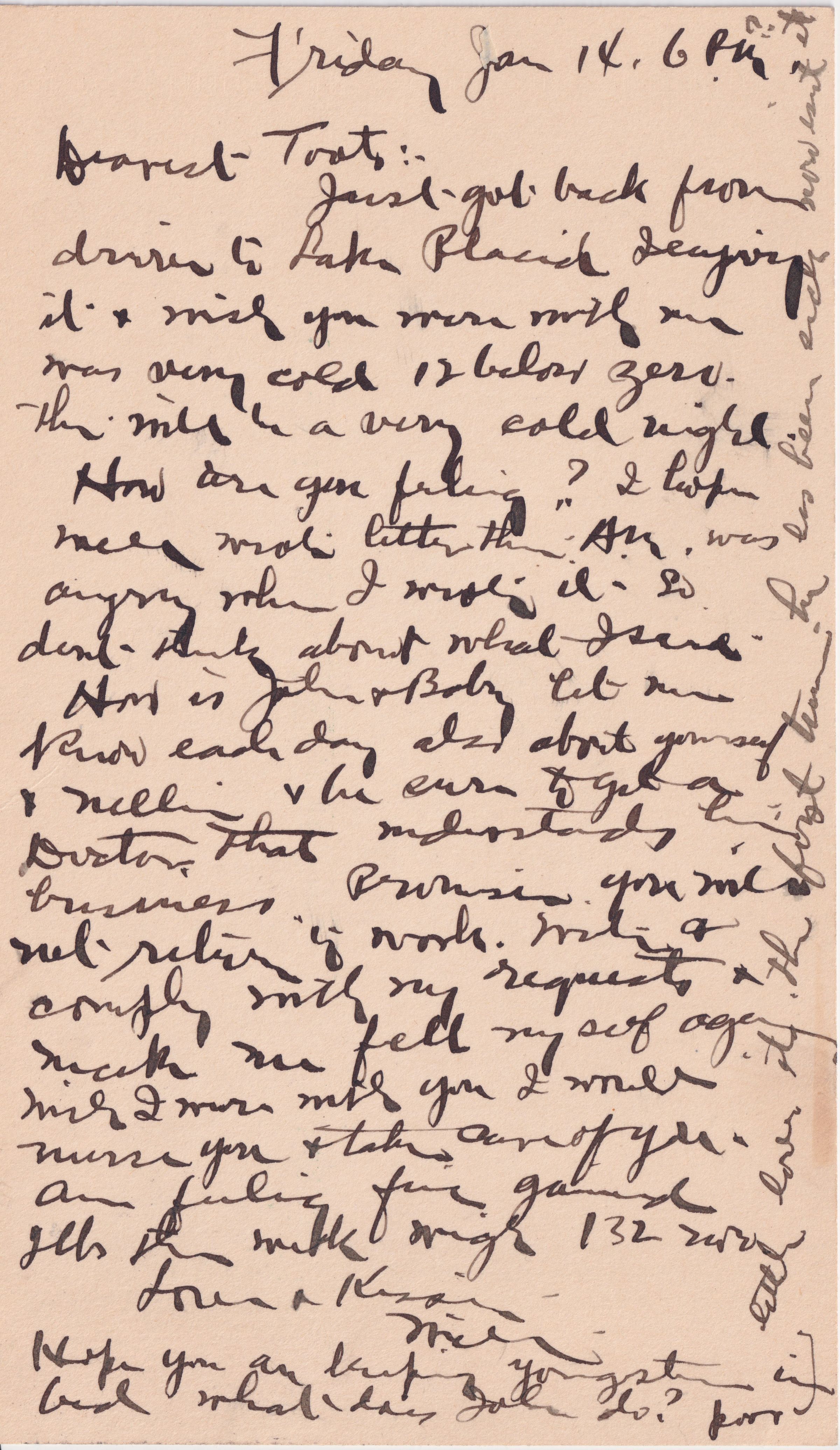 Postcard from William to Tarsilla Schuster dated January 14, 1916. Message reads, "Friday Jan 14, 6pm. Dearest Toots, Just got back from driving to Lake Placid. I enjoy it and wish you were with me was very cold 12 below zero. This will be a very cold night. How are you feeling? I looked at my (?) letter this AM. Was angry when I wrote it. So don't think about what I said. How is John and Baby let me know each day also about yourself and Nellie and be sure to get a doctor that understands business. Promise you will not return to work. (?) and comply with my requests and make me feel my (?) age. Wish I were with you I would nurse you and take care of you. Am feeling fine gained 9lbs the (?) weigh 132 now. Love and kisses, Will." Next lines are illegible. Addressed to "Mrs. W.J. Schuster, 103 Ditmas Ave Brooklyn, N.Y. c/o Mrs. M.A. Fletcher" and postmarked in Ray Brook.Collection