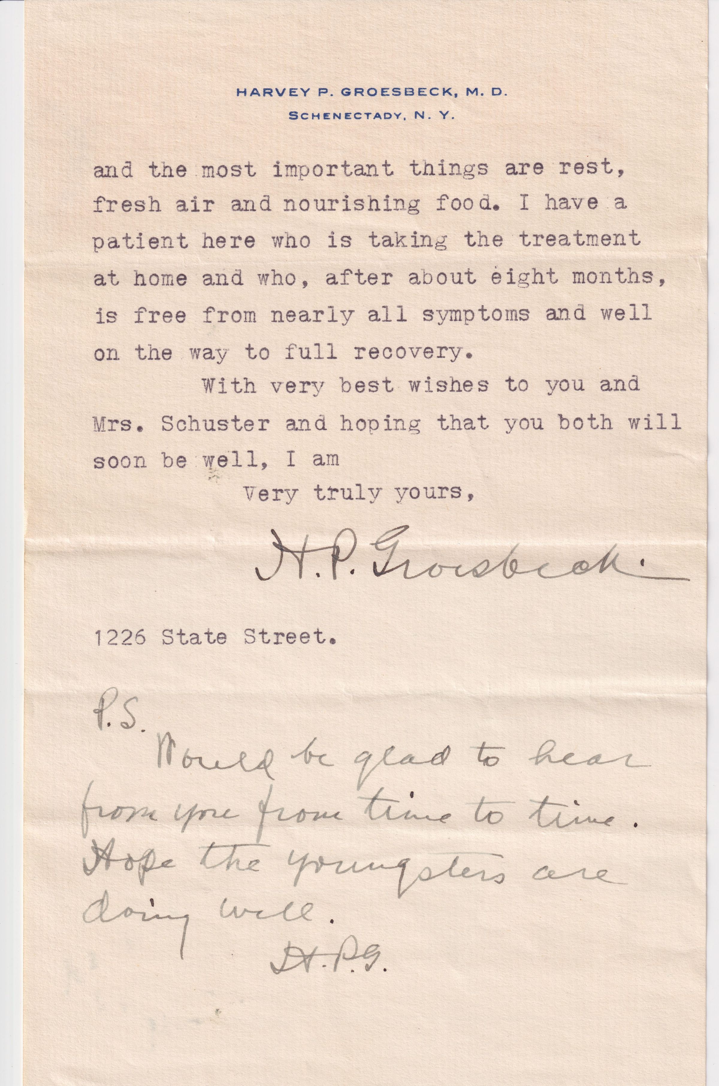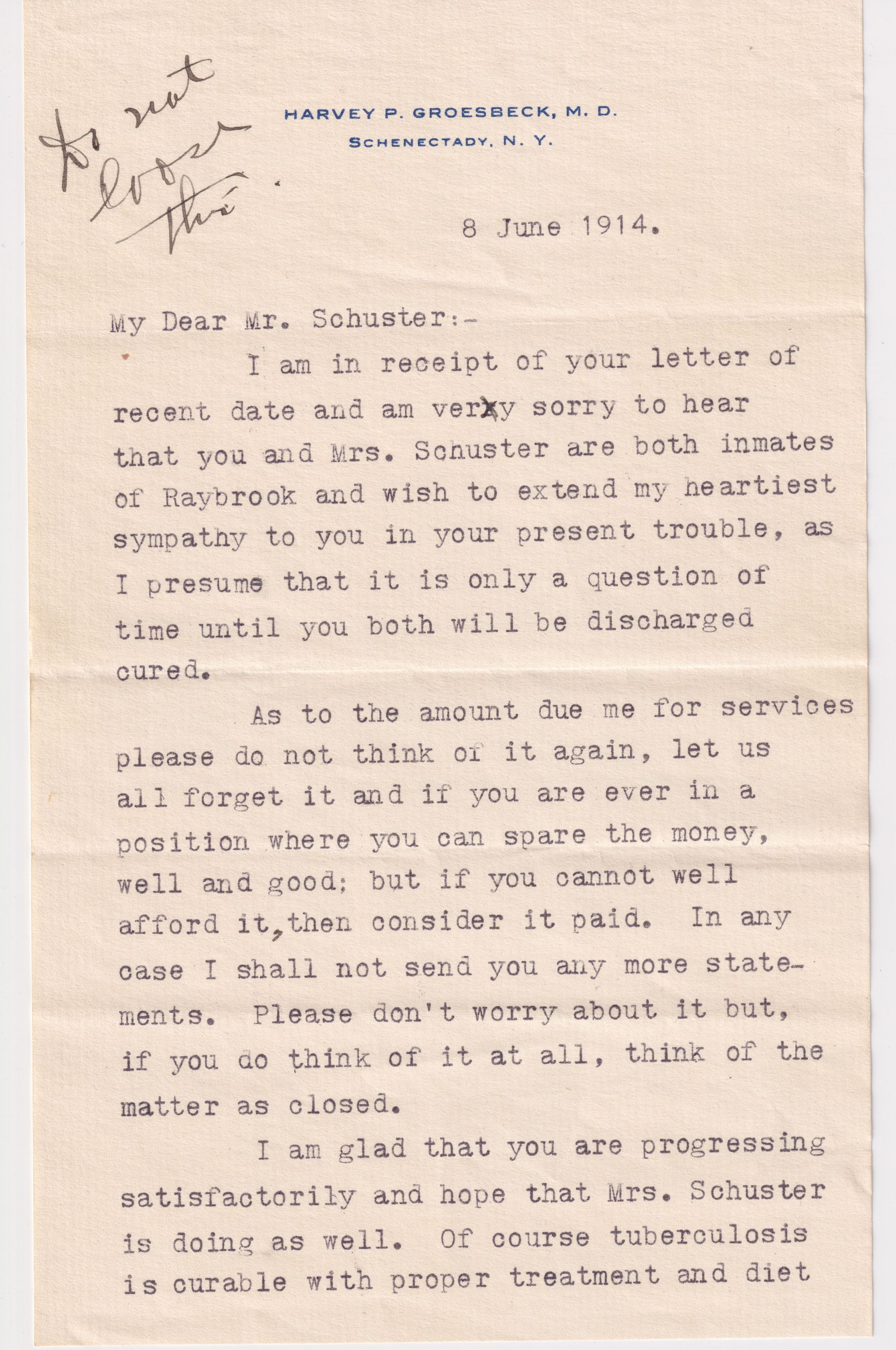 Two page typewritten letter on the letterhead of Harvey P. Groesbeck, M.D. in Schenectady, NY. It reads, "8 June, 1914. My Dear Mr. Schuster, I am in receipt of your letter of recent date and am very sorry to hear that you and Mrs. Schuster are both inmates of Raybrook and wish to extend my heartiest sympathy to you in your present trouble, as I presume that it is only a question of time until you both will be discharged cured. As to the amount due me for services please do not think of it again, let us all forget it and if you are ever in a position where you can spare the money, well and good; but if you cannot well afford it, then consider it paid. In any case I shall not send you any more statements. Please don't worry about it but, if you do think of it at all, think of the matter as closed. I am glad that you are progressing satisfactorily and hope that Mrs. Schuster is doing as well. Of course tuberculosis is curable with proper treatment and diet and the most important things are rest, fresh air and nourishing food. I have a patient here who is taking the treatment at home and who, after about eight months, is free from nearly all symptoms and well on the way to full recovery. With very best wishes to you and Mrs. Schuster and hoping that you both will soon be well, I am very truly yours, H.P. Groesbeck, 1226 State Street. P.S. Would be glad to hear from you from time to time. Hope the youngsters are doing well. H.P.G."Collection