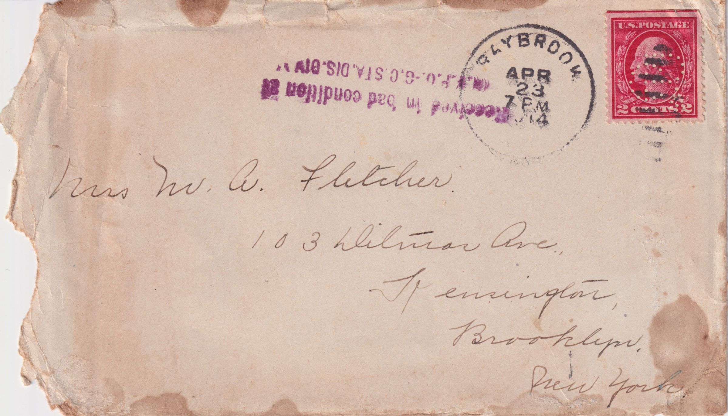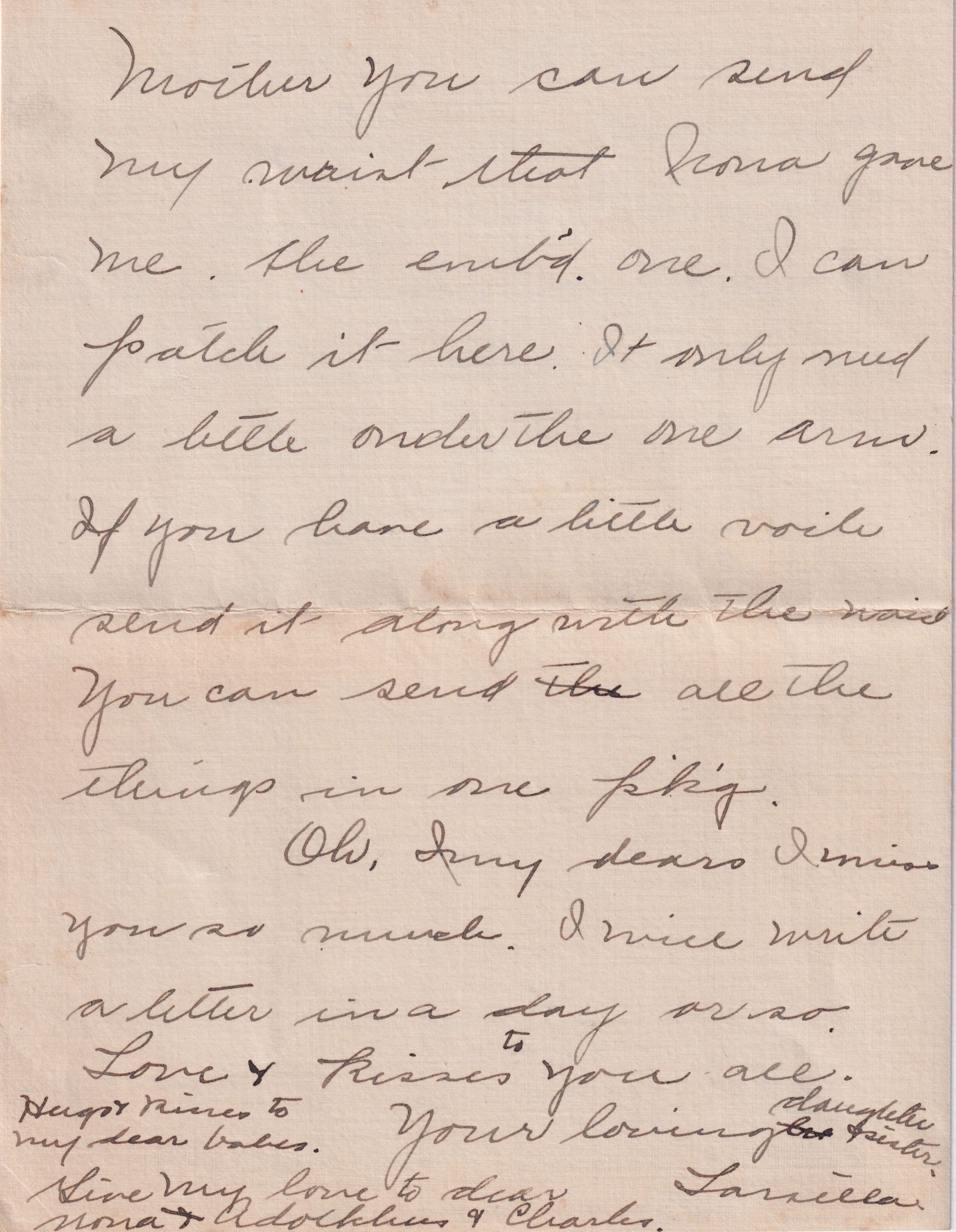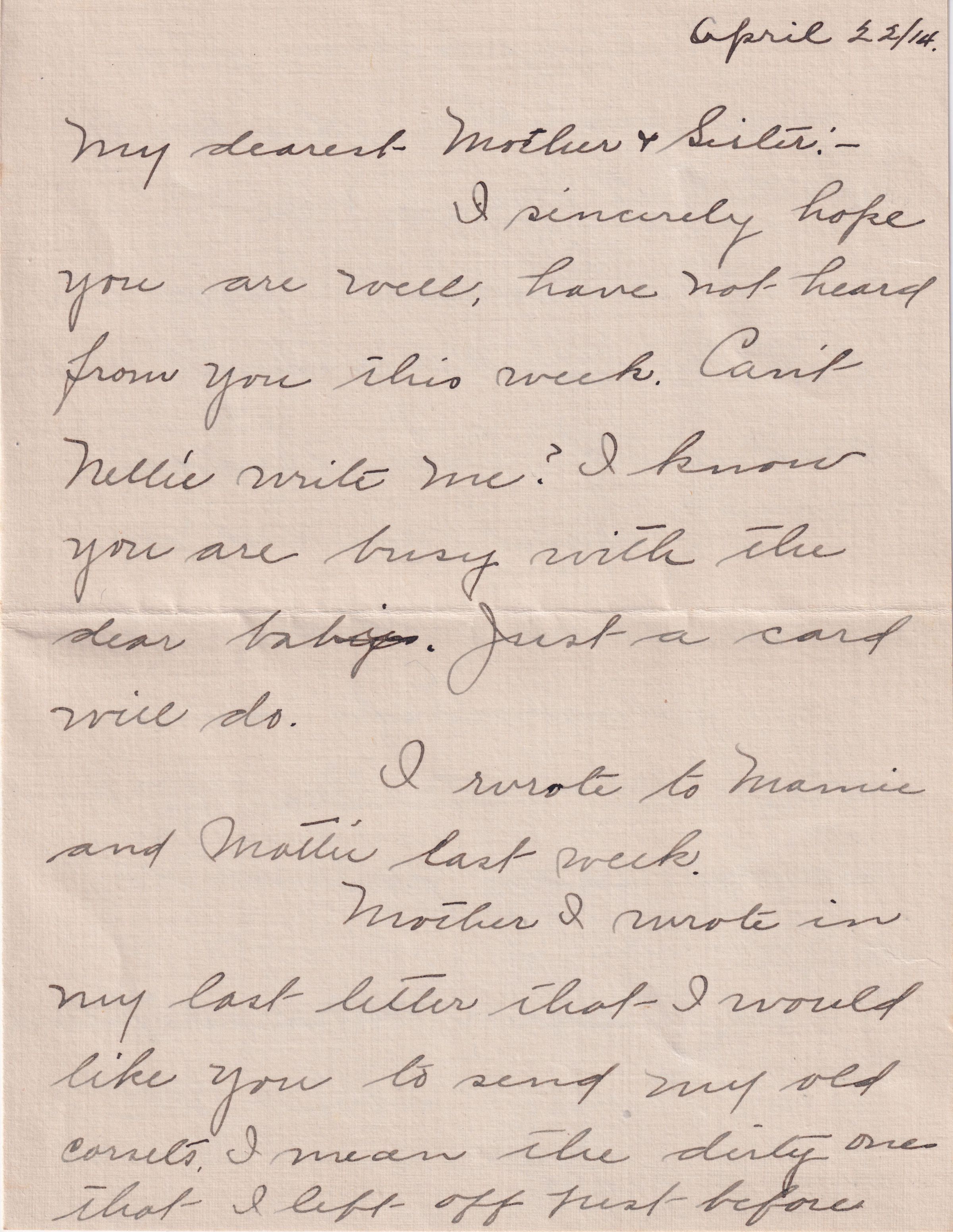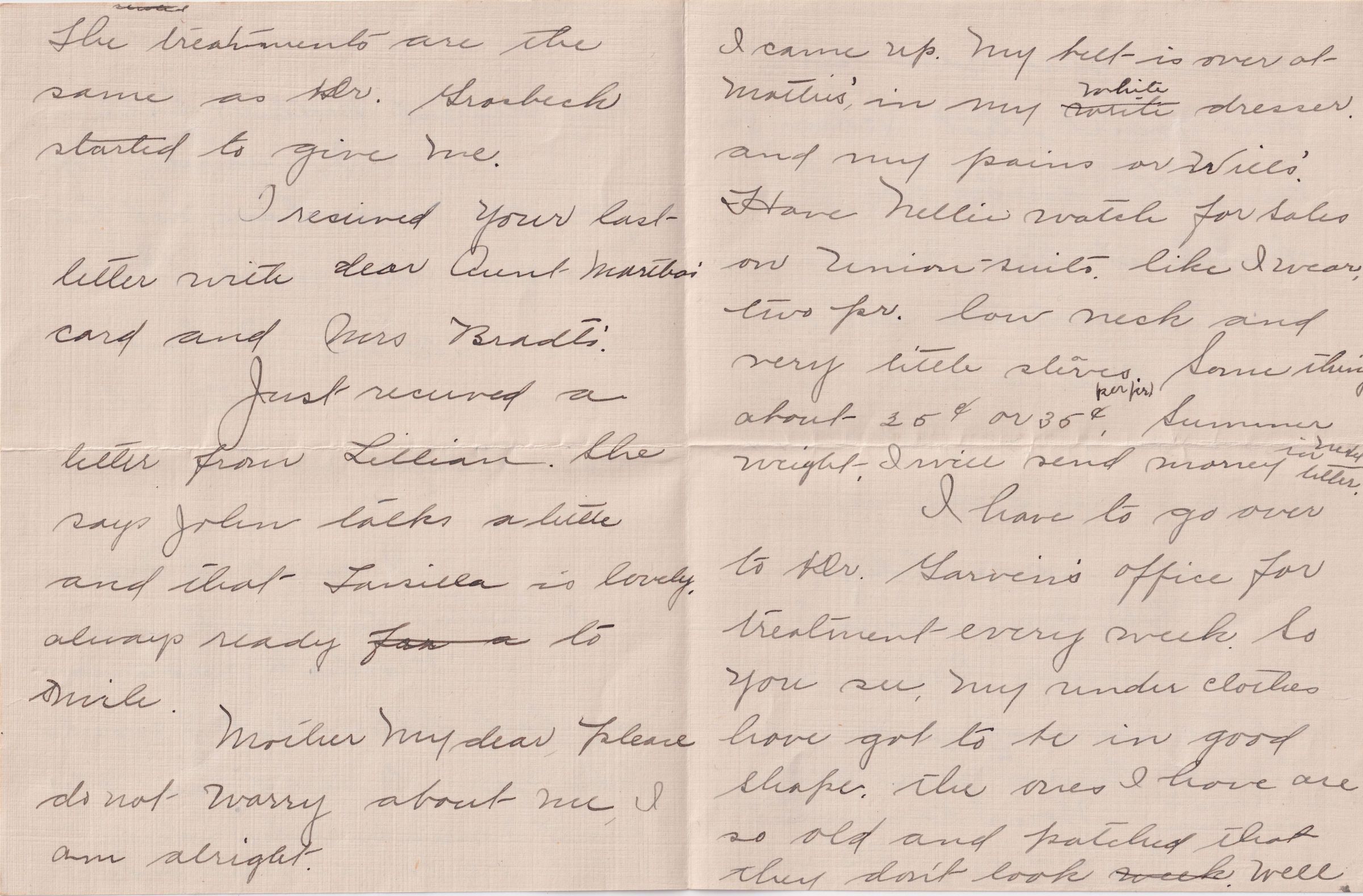 Letter from Tarsilla Schuster to her mother and sister dated April 22, 1914. It reads, "My dearest Mother and Sister, I sincerely hope you are well, have not heard from you this week. Can't Nellie write me? I know you are busy with the dear babies. Just a card will do. I wrote to Mamie and Mattie last week. Mother I wrote in my last letter that I would like you to send my old corsets. I mean the dirty one that I left off just before I came up. My belt is over at Mattie's, in my white dresser and my (?) or Wills'. Have Nellie watch for sales on Union suits like I wear, two pr. low neck and very little sleeves. Something about 20 cents or 35 cents. Summer weight. I will send money in next letter. I have to go over to Dr. Garven's office for treatment every week. So you see my underclothes have got to be in good shape. The ones I have are so old and patched that they don't look well. The treatments are the same as Dr. Groesbeck started to give me. I received your last letter with dear Aunt (?) card and Mrs. (?). Just received a letter from Lillian. She says John talks a little and that Tarsilla is lovely. Always ready for a smile. Mother my dear, please do not worry about me, I am alright. Mother you can send my waist (?) Nona gave me. She (?) one. I can patch it here. It only needs a little under the one arm. If you have a little (?) send it along with the waist. You can send all the things in one pkg. Oh, my dears I miss you so much. I will write a letter in a day or so. Love and kisses to you all. Hugs and kisses to my dear babes. Your loving daughter and sister, Tarsilla. Give my love to dear Nona and (?) and Charles." Included envelope addressed to "Mrs. M.A. Fletcher 103 Ditmas Ave, Kensington, Brooklyn, New York" and postmarked April 23, 1914 in Ray Brook.Collection