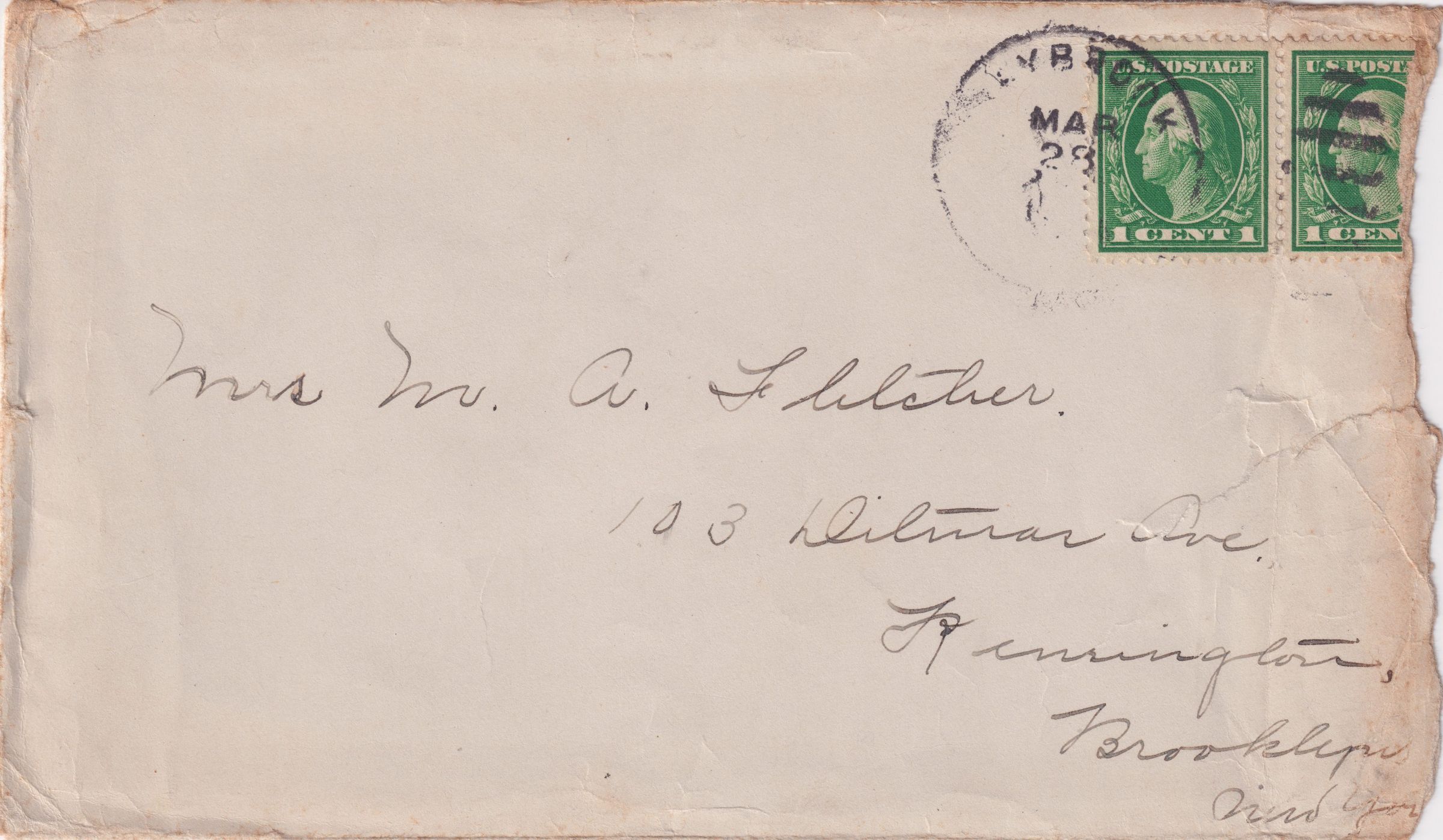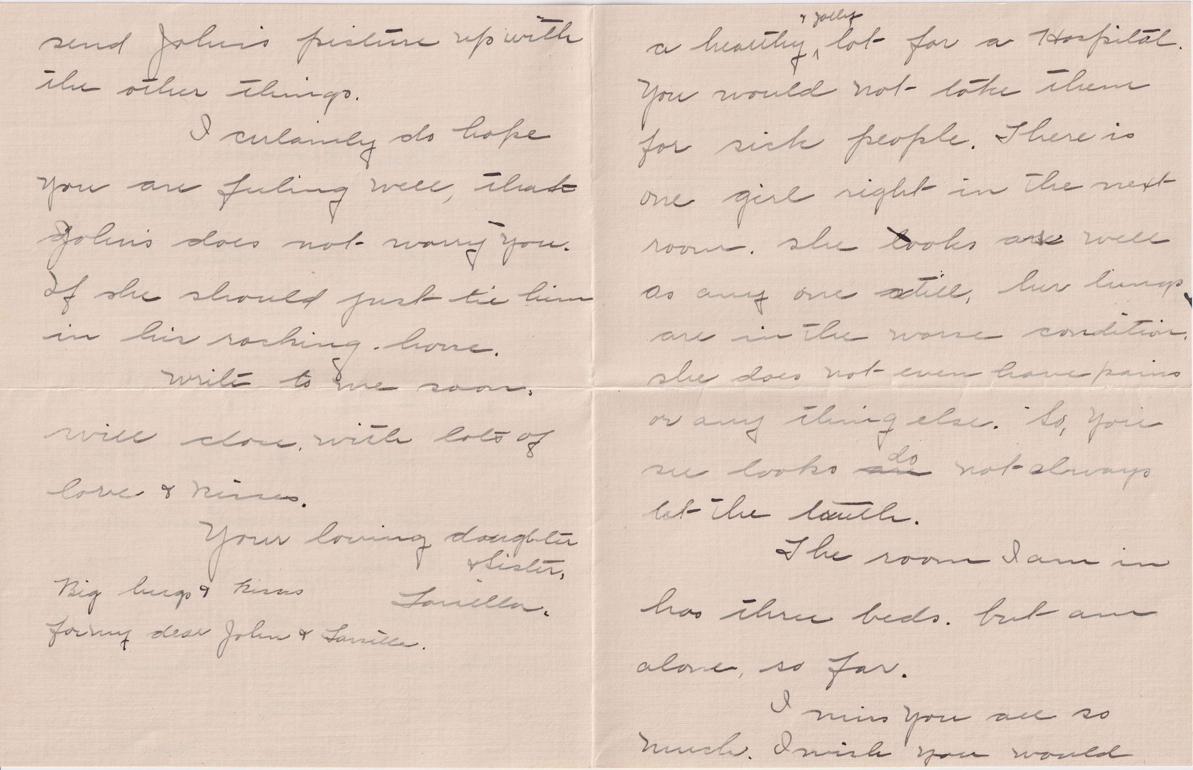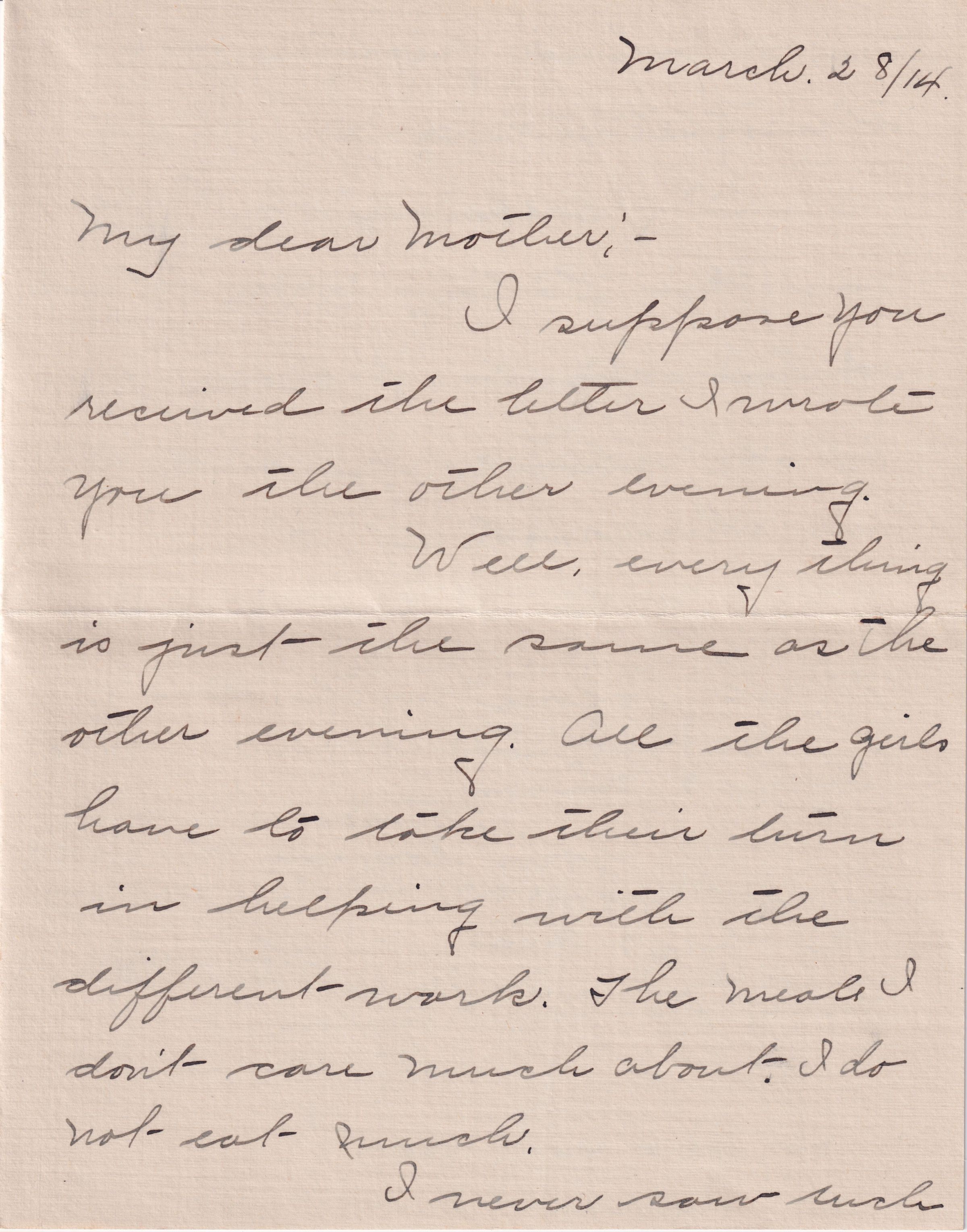 Letter from Tarsilla Schuster to her mother, dated March 28, 1914. It reads, "My dear Mother, I suppose you received the letter I wrote you the other evening. Well, everything is just the same as the other evening. All the girls have to take their turn in helping with the different work. The meals I don't care much about. I do not eat lunch. I never saw such a healthy and jolly lot for a hospital. You would not take them for sick people. There is one girl right in the next room. She looks as well as any one still, her lungs are in the worst condition. She does not even have pains or anything else. So, you see looks do not always tell the truth. The room I am in has three beds but am alone, so far. I miss you all so much. I wish you would send John's picture up with the other things. I certainly do hope you are feeling well, that John does not worry you. If he should just tie him in his rocking horse. Write to me soon. Will close with lots of love and kisses. Your loving daughter and sister, Tarsilla. Big hugs and kisses for my dear John and Tarsilla." Included envelope addressed to "Mrs. M.A. Fletcher 103 Ditmas Ave, Kensington, Brooklyn, New York" and postmarked in Ray Brook on March 28, 1914.Collection