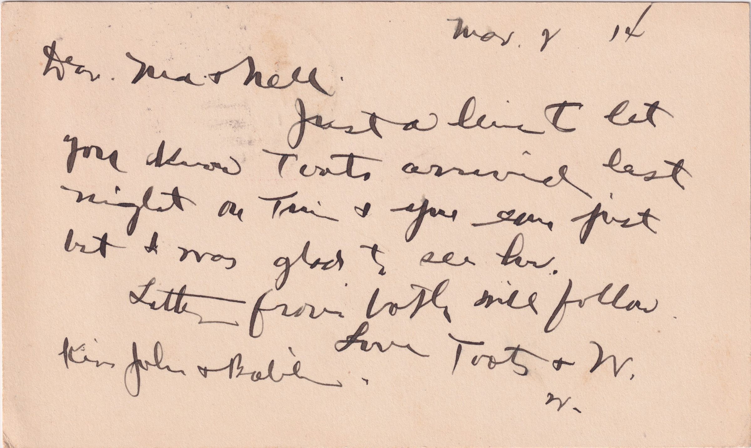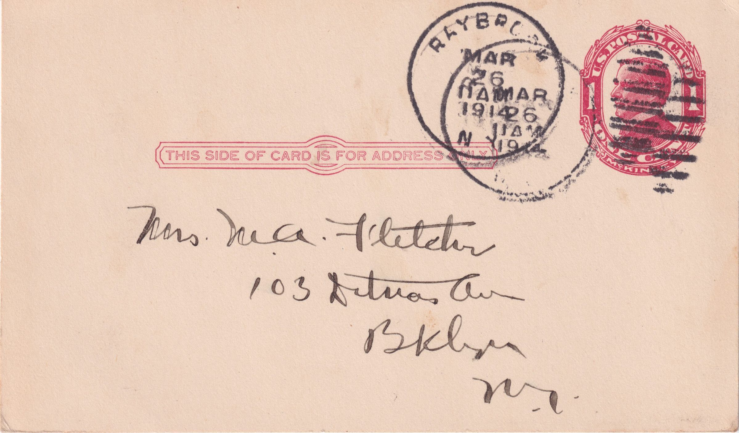 Postcard from William Schuster to Tarsilla's family letting them know of her arrival at Ray Brook. Postmarked March 26, 1914.