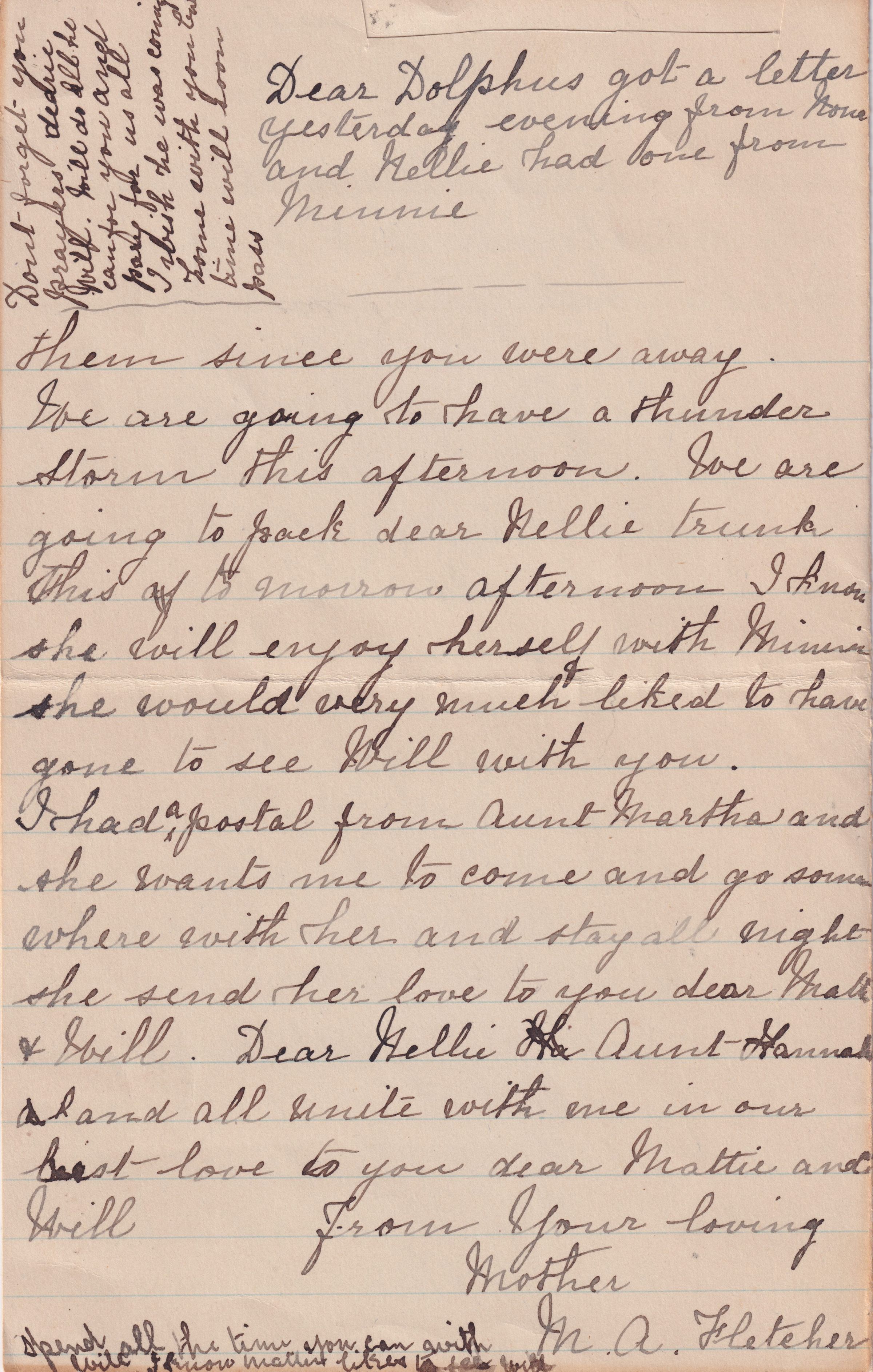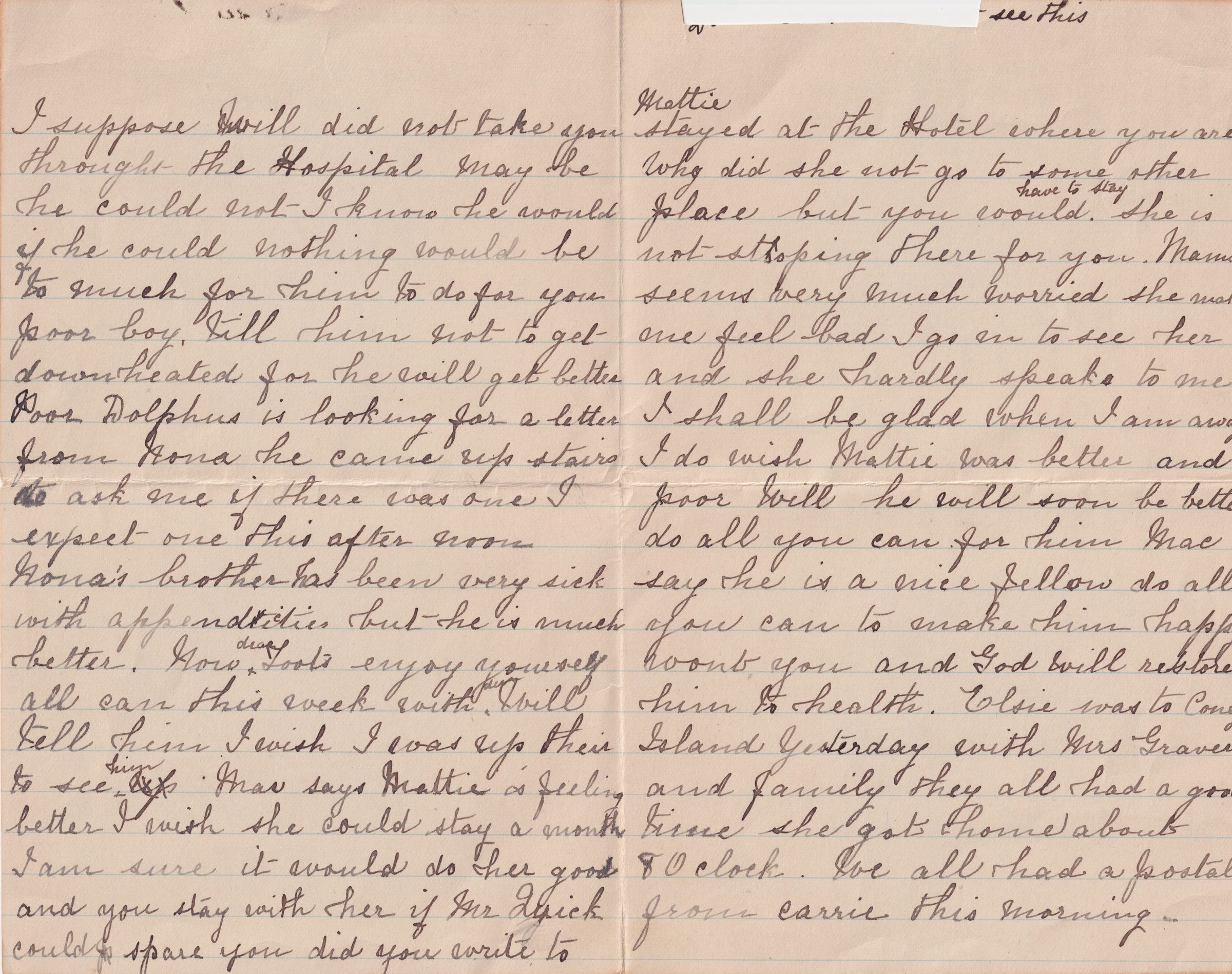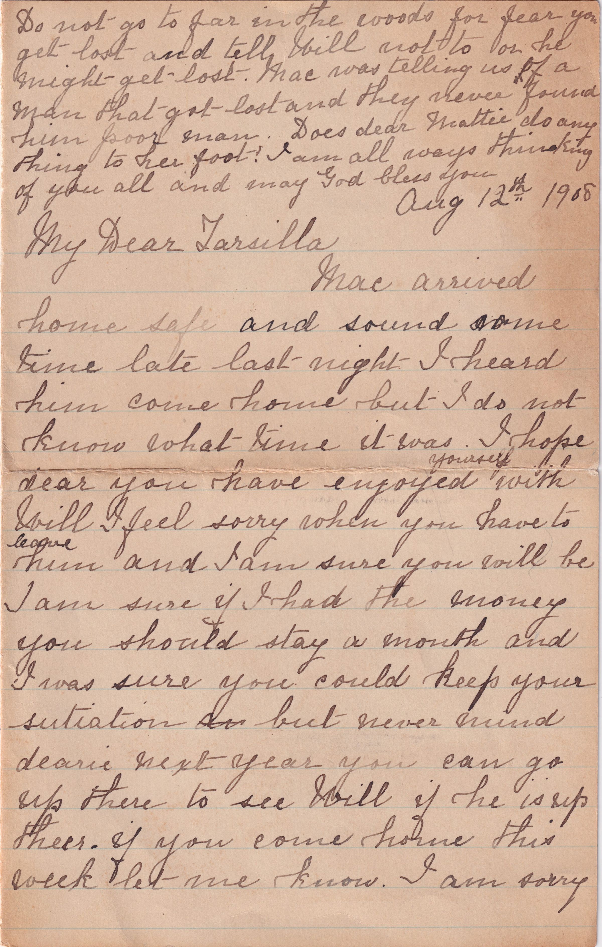 Letter from Tarsilla Schuster's mother to Tarsilla, dated August 12, 1908, regarding Tarsilla's visit to see William at Ray Brook.
