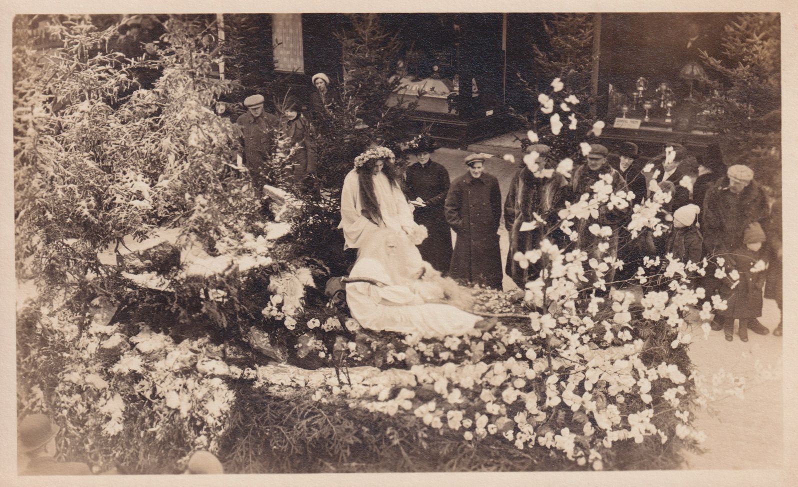 Black-and-White photograph of a Winter Carnival float moving through downtown. The float features a man dressed as "Father Time" and a woman with a flower crown, both wearing long white robes amidst greenery. People can be seen standing on the sidewalks. Handwritten note on reverse reads, "1913."Photograph Details