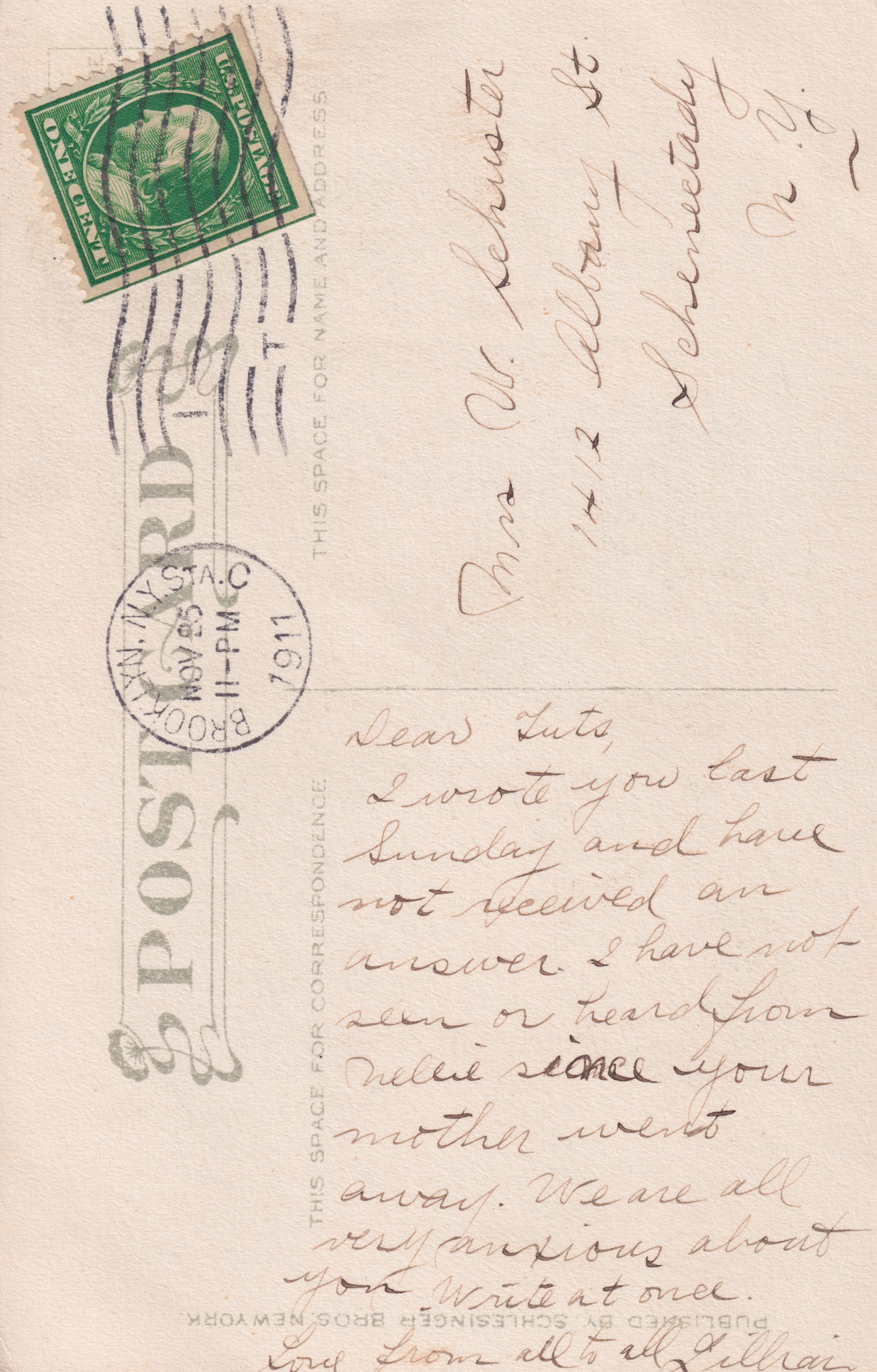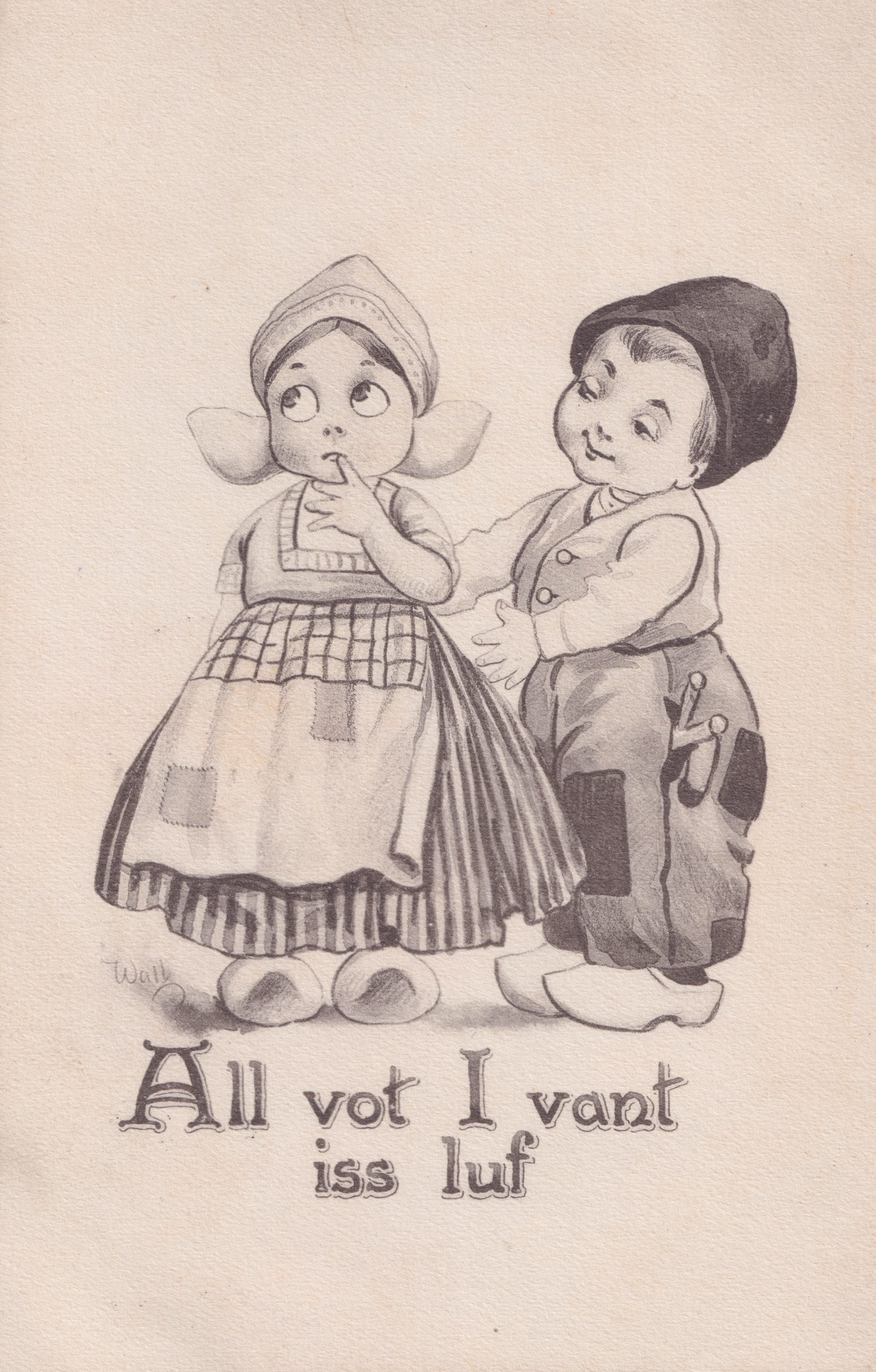 Postcard sent to Tarsilla Schuster by "Lillian". Postmarked November 25, 1911, from Brooklyn, NY. It reads, "Dear Tuts, I wrote you last Sunday and have not received an answer. I have not seen or heard from Nellie since your mother went away. We are all very anxious about you. Write at once. Love from all to all, Lillian." The postcard shows a cartoon of a boy and girl in traditional Dutch clothing with the caption, "All vot I vant iss luf."Collection