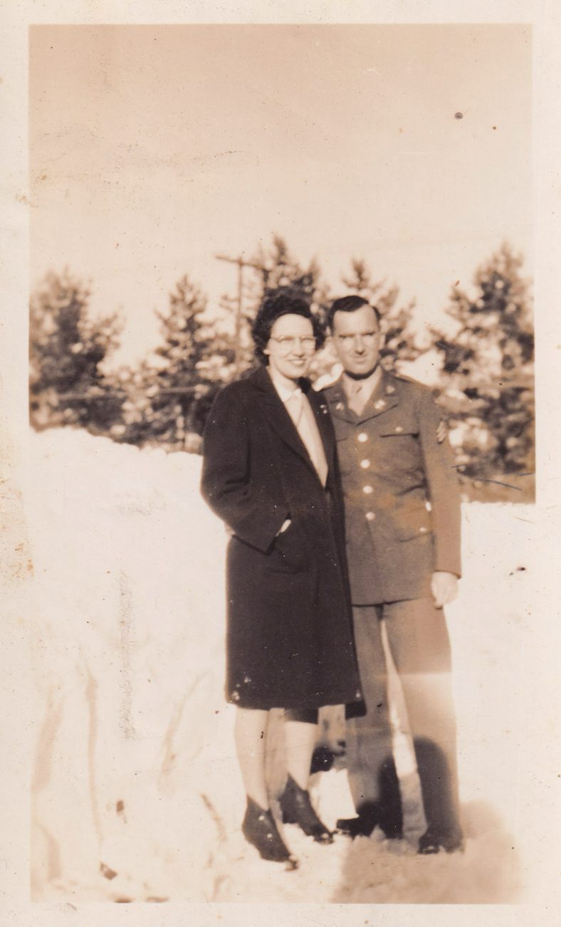 Black-and-White photograph of an unidentified man and a woman standing in the snow. The man is wearing a military uniform. The photograph was likely printed by Kollecker's Kodak and Gift Shop.