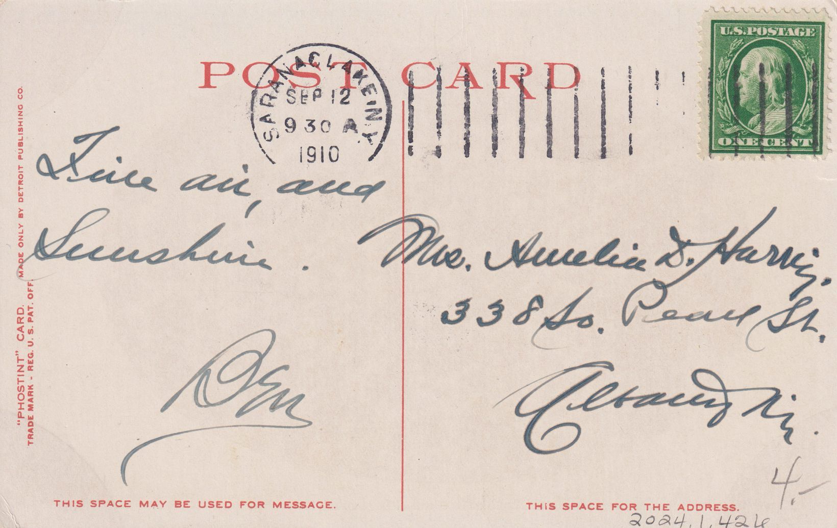 Postcard with an aerial illustration of Trudeau Sanatorium. The postcard is addressed to Mrs. Amelia D. Harris.
