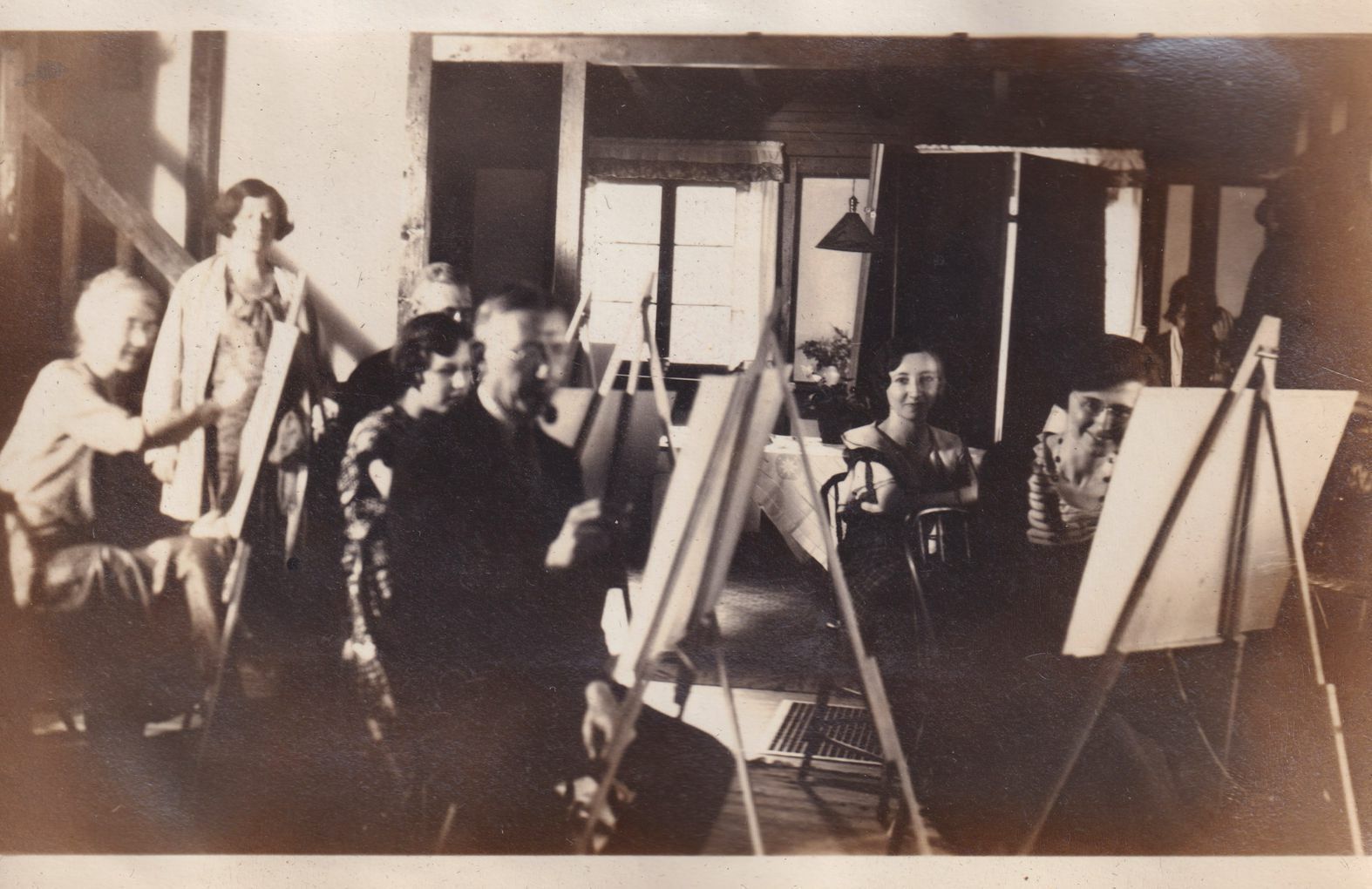 Black-and-White photograph of a group of students in an art class taught by Amy Jones at Danforth Cottage. Amy Jones is standing in the rear.