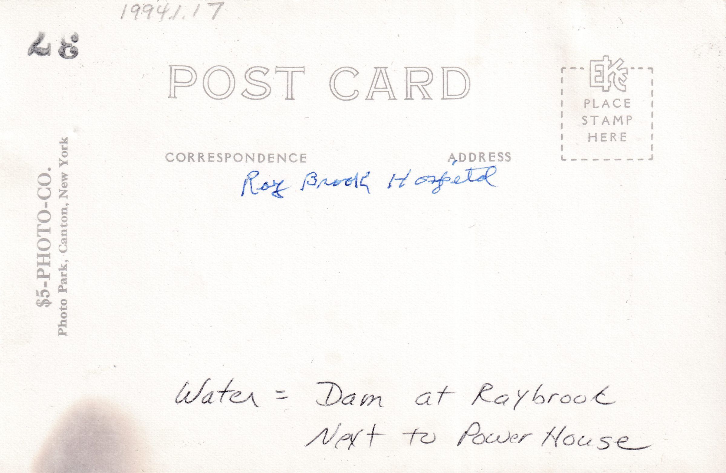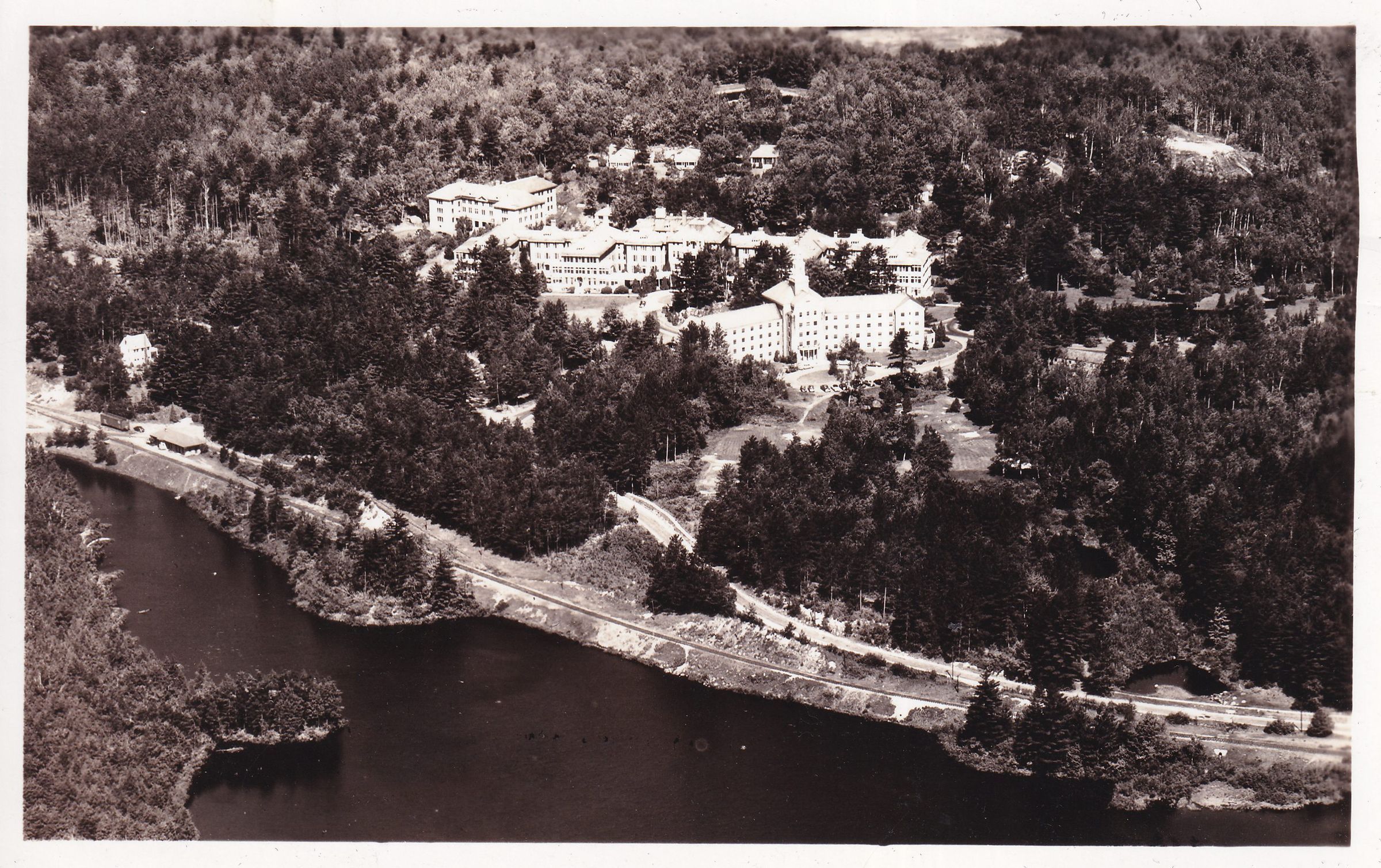Black-and-White photograph postcard showing aerial view of the New York State Hospital for Incipient Tuberculosis, AKA Ray Brook Sanatorium, looking to the northwest. Not mailed, undivided back, white border. Handwritten notes on back read, "Ray Brook Hospital," and "Water = Dam at Raybrook [sic] next to Power House." Note with postcard read, "Drs. Residence - Dr. Fruhlinger lived here," with circle around small house at top center of image. Printed by $5-Photo-Co., Photo Park, Canton, New York.Subject Place