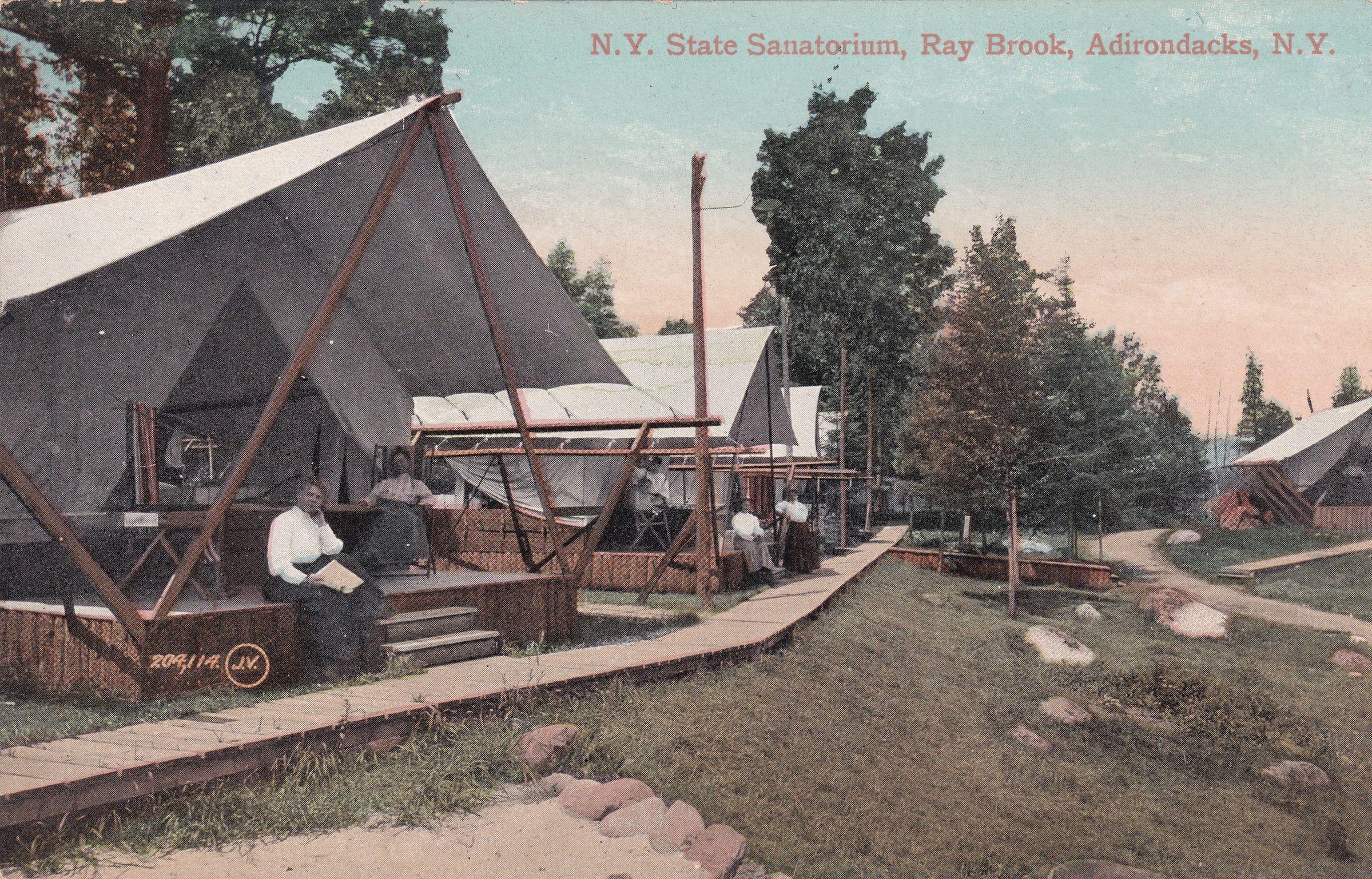 Color postcard of the patient tent platforms at the New York State Hospital for Incipient Tuberculosis, AKA Ray Brook Sanatorium. Several female patients can be seen sitting on the porches. Printed caption on the front reads, "N. Y. State Sanatorium, Ray Brook, Adirondacks, N. Y." Unused, divided back. Printed by the Valentine & Sons' Publishing Co., Ltd., New York.Subject Place