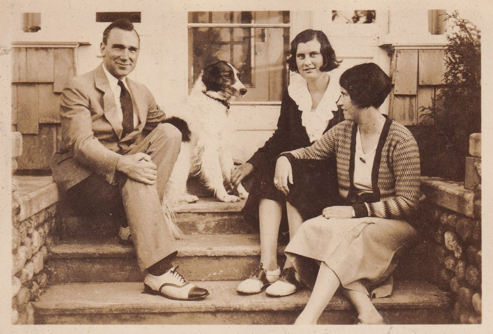 Black-and-White photograph of the Hurley sisters, lifelong friends of Amy Jones, sitting with an unidentified man (possibly their brother). They are all seated on the front steps of the Jones Family's second home in Saranac Lake, possibly 453 Lake Street. There is an unidentified dog with them.