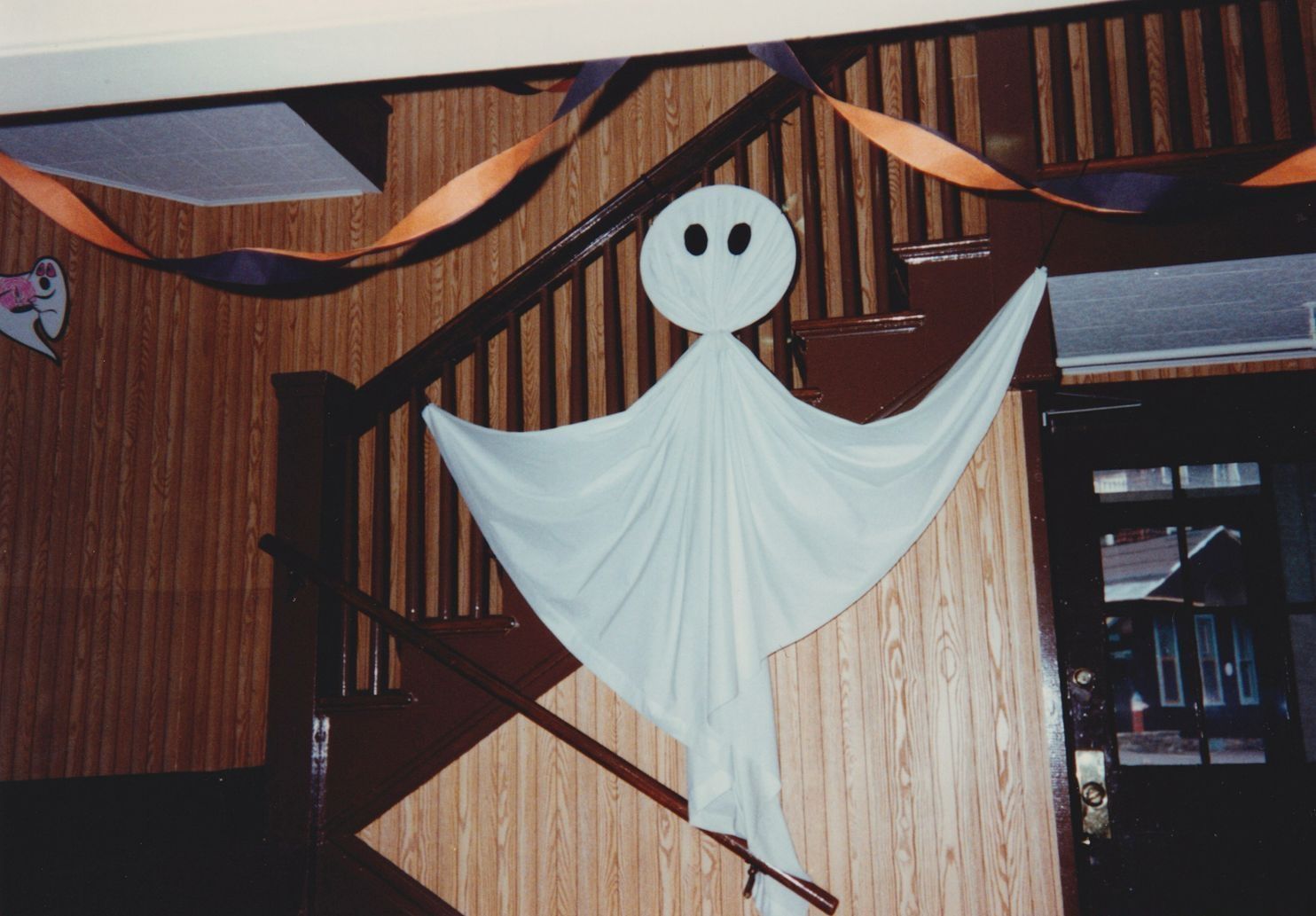 Color photograph of a stairwell decorated for Halloween. There is a fake ghost hanging from the railing and black and orange streamers. This photograph is from an album of photographs taken at the American Management Association.