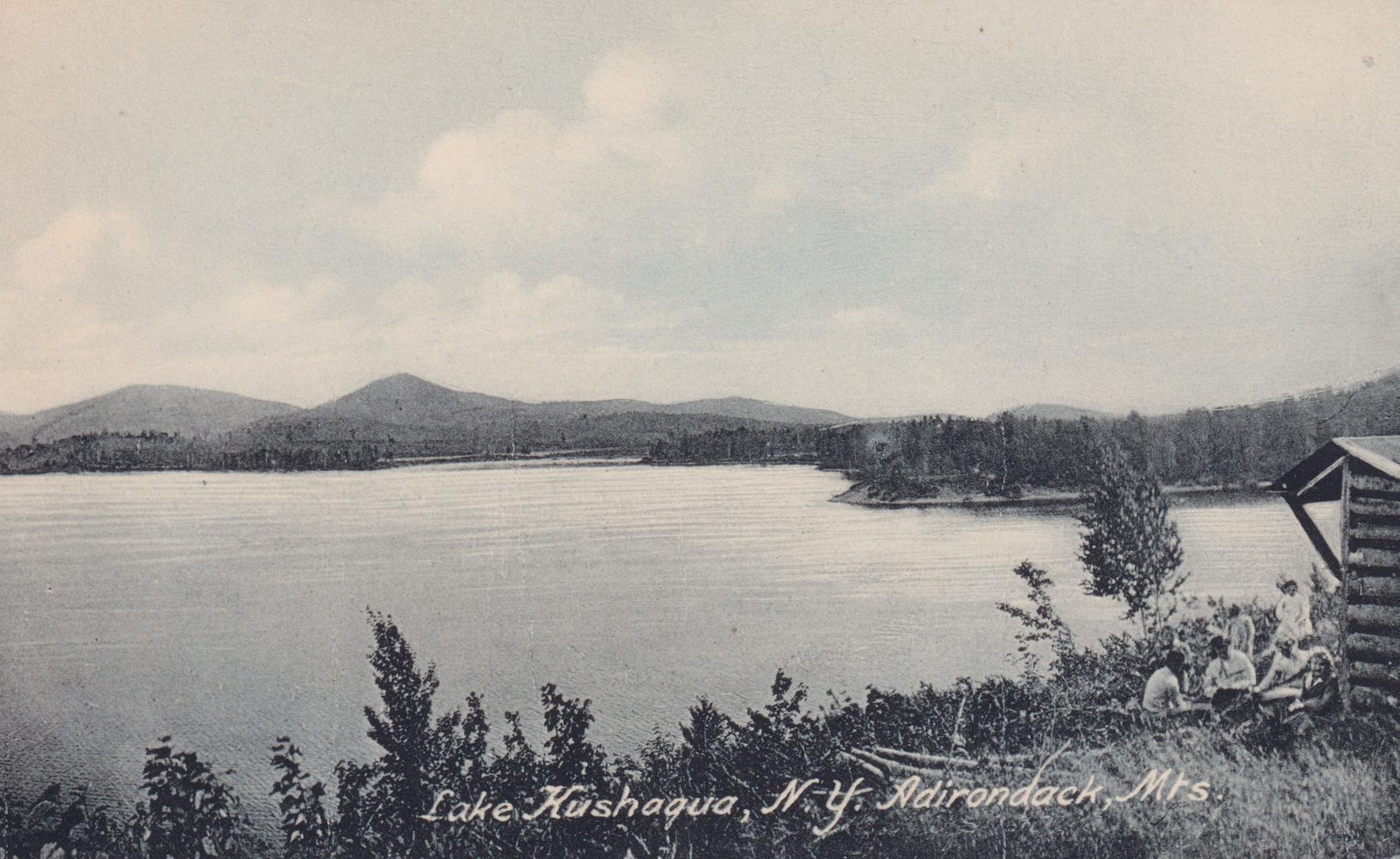 Black-and-White postcard showing Lake Kushaqua. Several people can be seen seated by a lean-to on the shore. Printed caption on front reads, "Lake Kushaqua, N. Y. Adirondack, Mts." Entire back is blank.Subject Place