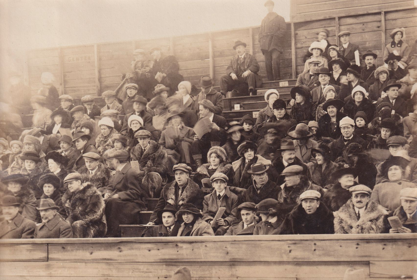 Black-and-white photograph of a crowd of spectators sitting in the stands at the edge of the ice at Pontiac Bay next to Lake Flower. This item is not fully cataloged but has been uploaded so the image is publicly available; if you would like us to prioritize cataloging this item, please contact the HSL Collections team.