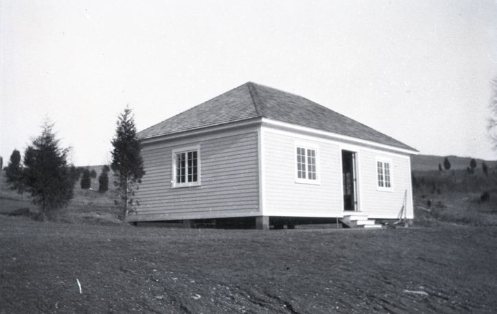 Negative of a small one-story building on a sparsely-tree covered hill. Most likely taken by Mary Ives Baldwin. This item is not fully cataloged but has been uploaded so the image is publicly available; if you would like us to prioritize cataloging this item, please contact the HSL Collections team.