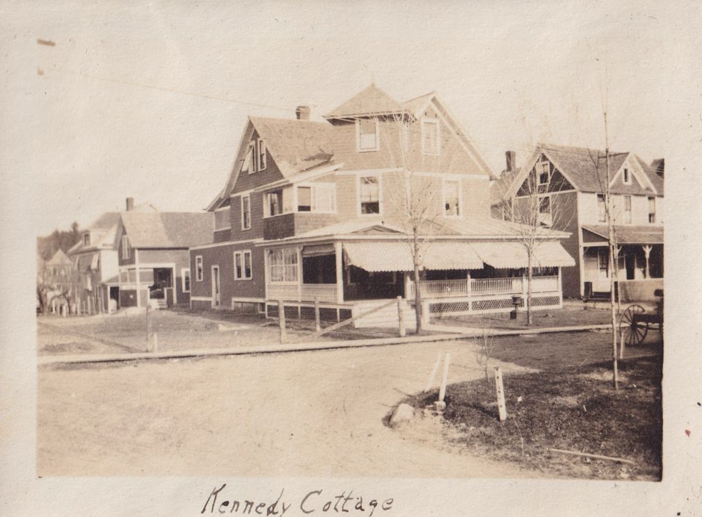 Black-and-white photograph of the cure cottage at 24/26 Shepard Avenue (now 98 Shepard Avenue). The cottage has three stories with a large first floor porch and at least one sleeping porch on the second floor. "Kennedy Cottage" is written in ink at the bottom of the photograph.