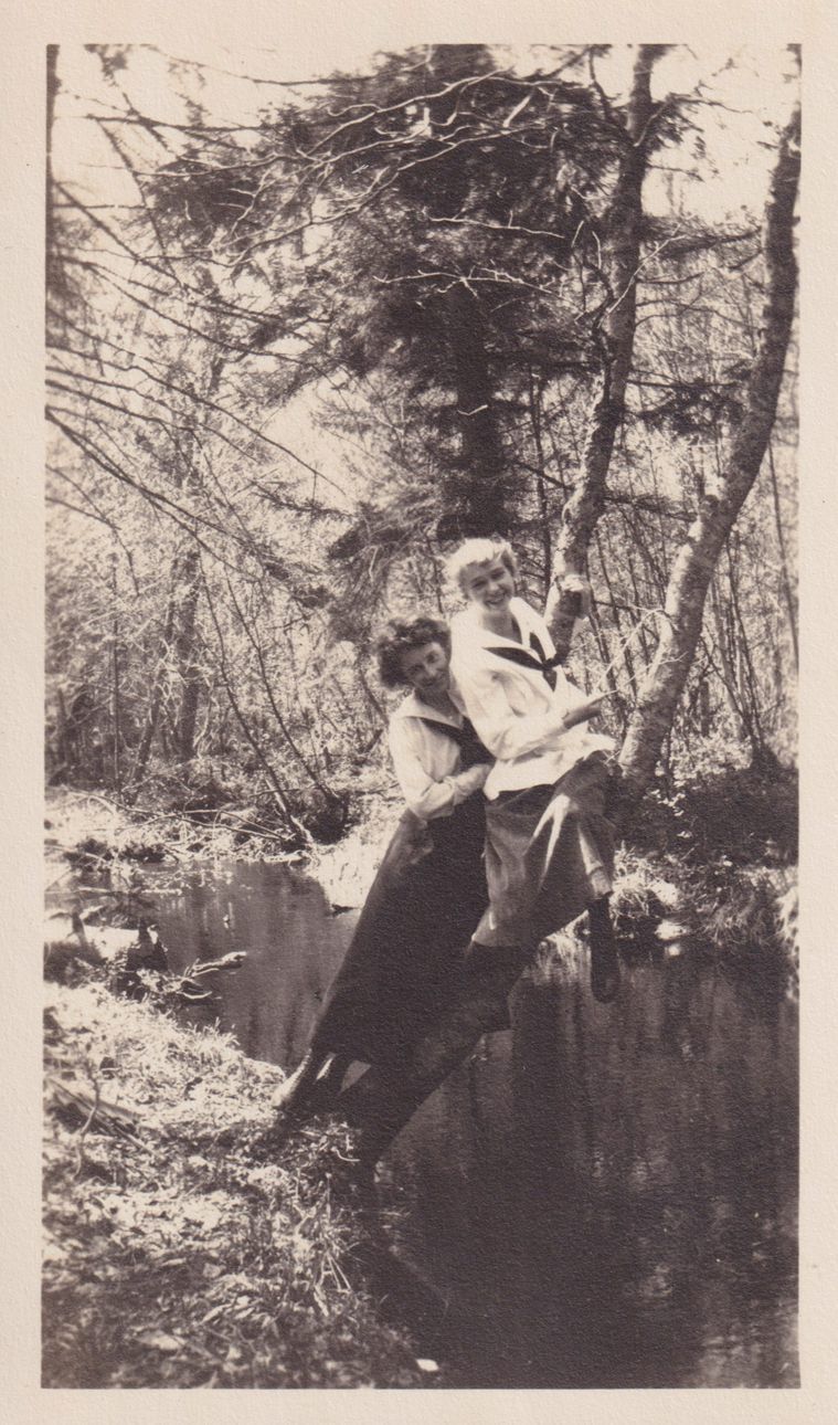 Black-and-White photograph of two women up a tree, hanging out over a stream. The photograph was likely printed by Kollecker's Kodak and Gift Shop.