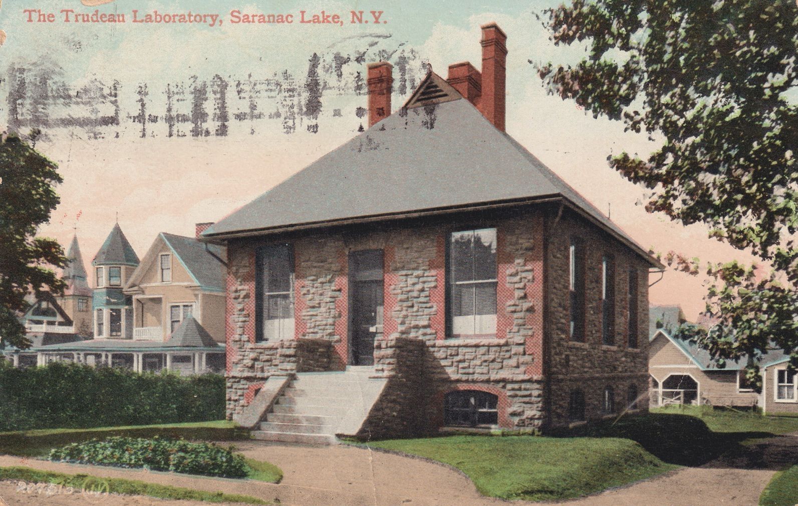 Color postcard showing the Saranac Laboratory (prior to 1920s renovation). Printed caption on front reads, "The Trudeau Laboratory, Saranac Lake, N. Y." Printed by the Valentine & Sons' Publishing Co., Ltd., New York. Used, divided back, postmarked Saranac Lake, January 10, 1910.