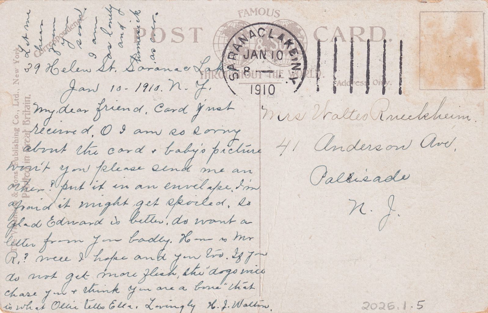 Handwritten message on reverse reads, "39 Helen St. Saranac Lake, N. Y. Jan 10-1910. My dear friend, Card just received, I am so sorry about the card & baby's picture. Won't you please send me another? Put it in an envelope, I'm afraid it might get spoiled. So glad Edward is better. Do want a letter from you badly. How is Mr. R.? Well I hope and you too. If you do not get more flesh, the "dogs will chase you & think you are a bone" that is what Ollie tells Ella. Lovingly, H. J. Walton. Let me hear from you soon. I am as lonely and homesick as ever." Mailed to Mrs. Walter Rueckheim, 41 Anderson Ave., Palisade, NJ.Subject Place