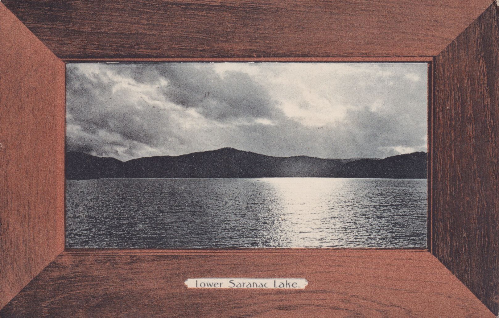 Color postcard a body of water, with a printed "wooden" frame around the image. Printed caption on front reads, "Lower Saranac Lake." Printed by the Rotograph Co., NYC. Used, divided back, postmarked Saranac Lake, August 12, 1908.