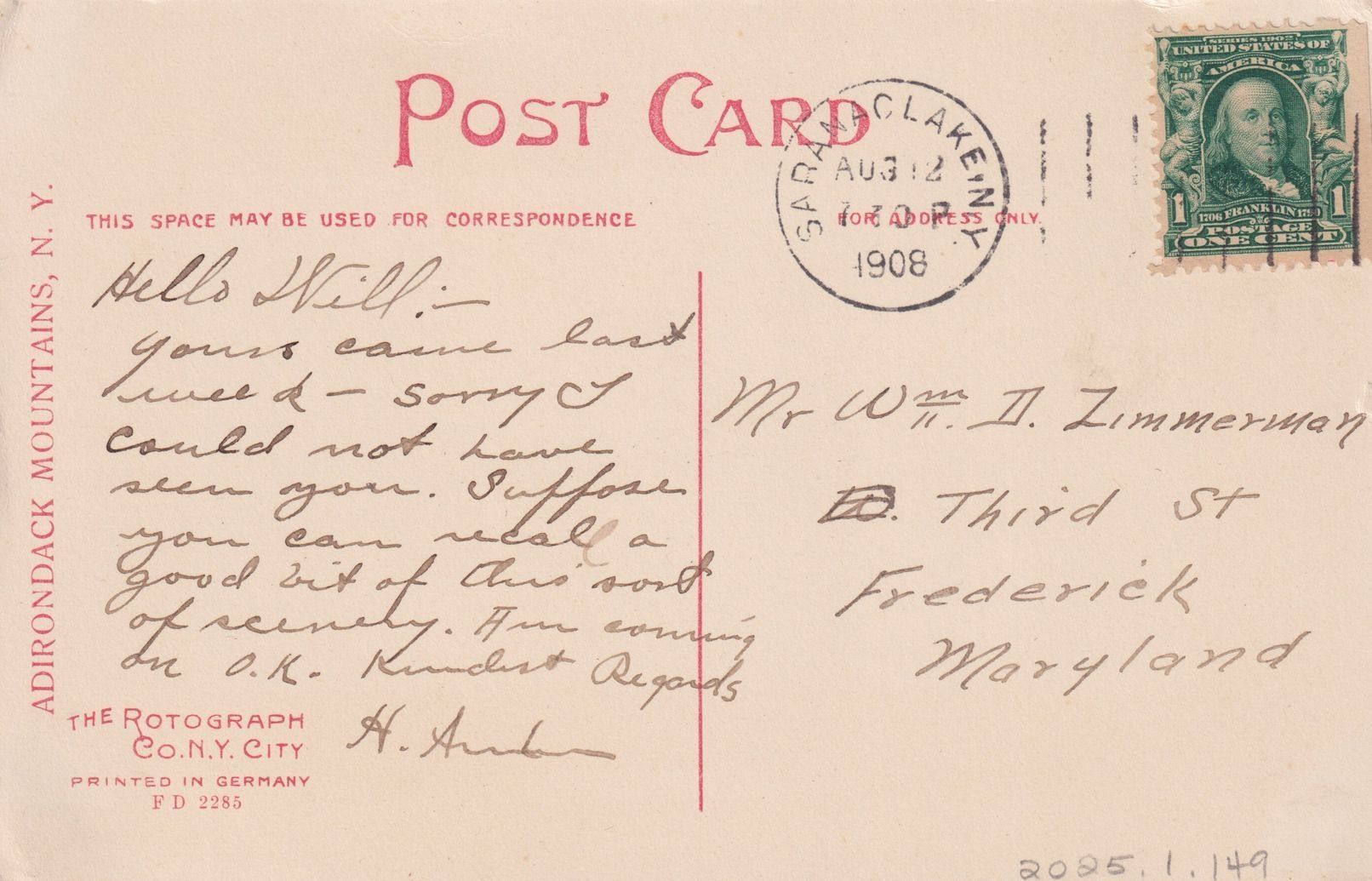 Handwritten message on reverse reads, "Hello Will, Yours came last week - Sorry I could not have seen you. Suppose you can recall a good bit of this sort of scenery. Am coming on O. K. Kindest regards, H. Anderson." Mailed to Mr. Wm. D. Zimmerman, Third St., Frederick, Maryland.Subject Place