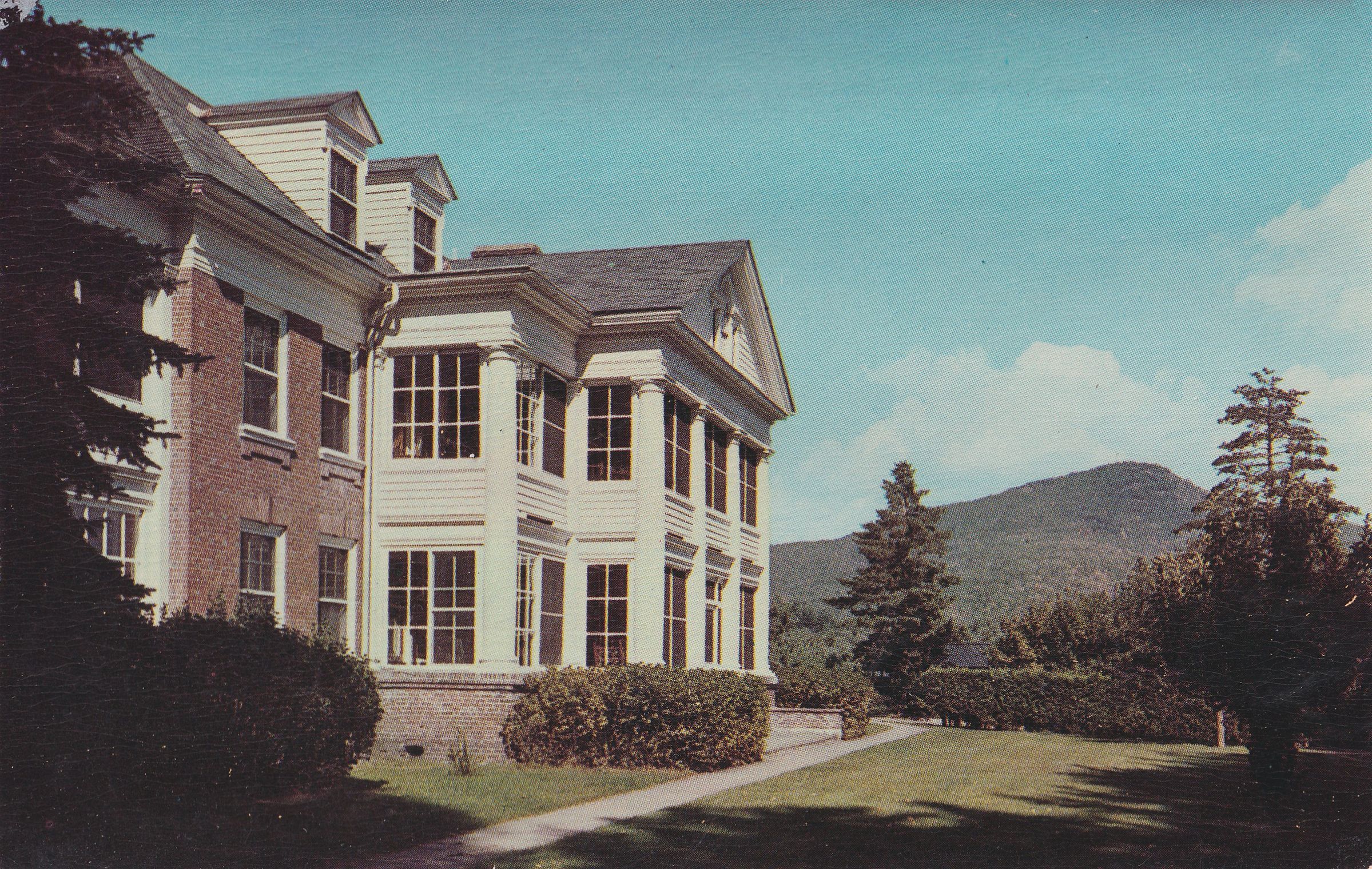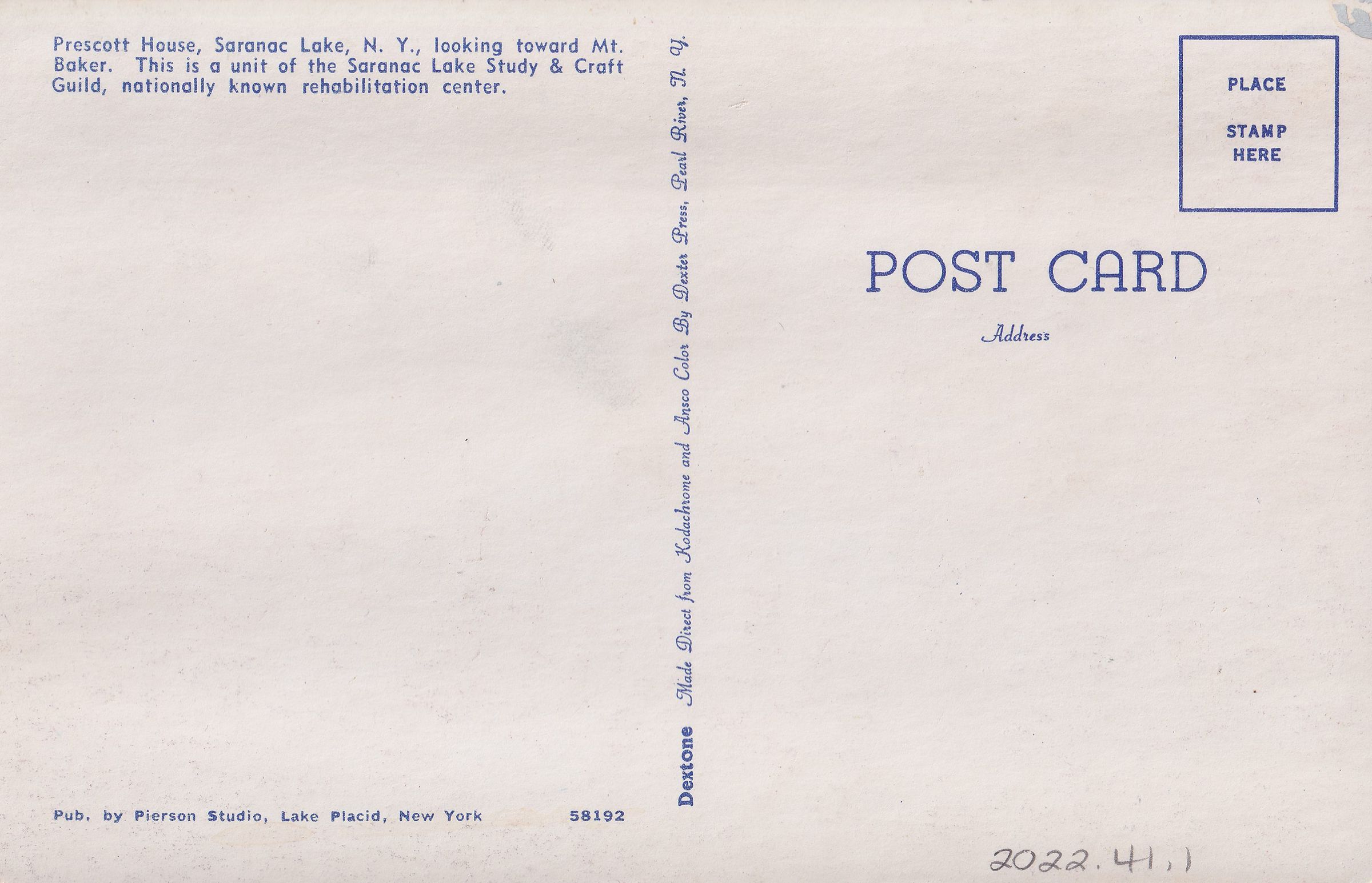 Color postcard showing the front of the Prescott House (formerly Reception Hospital) looking to the northeast toward Baker Mountain. Printed caption on reverse reads, "Prescott House, Saranac Lake, N. Y., looking toward Mt. Baker. This is a unit of the Saranac Lake Study & Craft Guild, nationally known rehabilitation center." Published by Pierson Studio, Lake Placid, NY. Unused, divided back.Subject Place