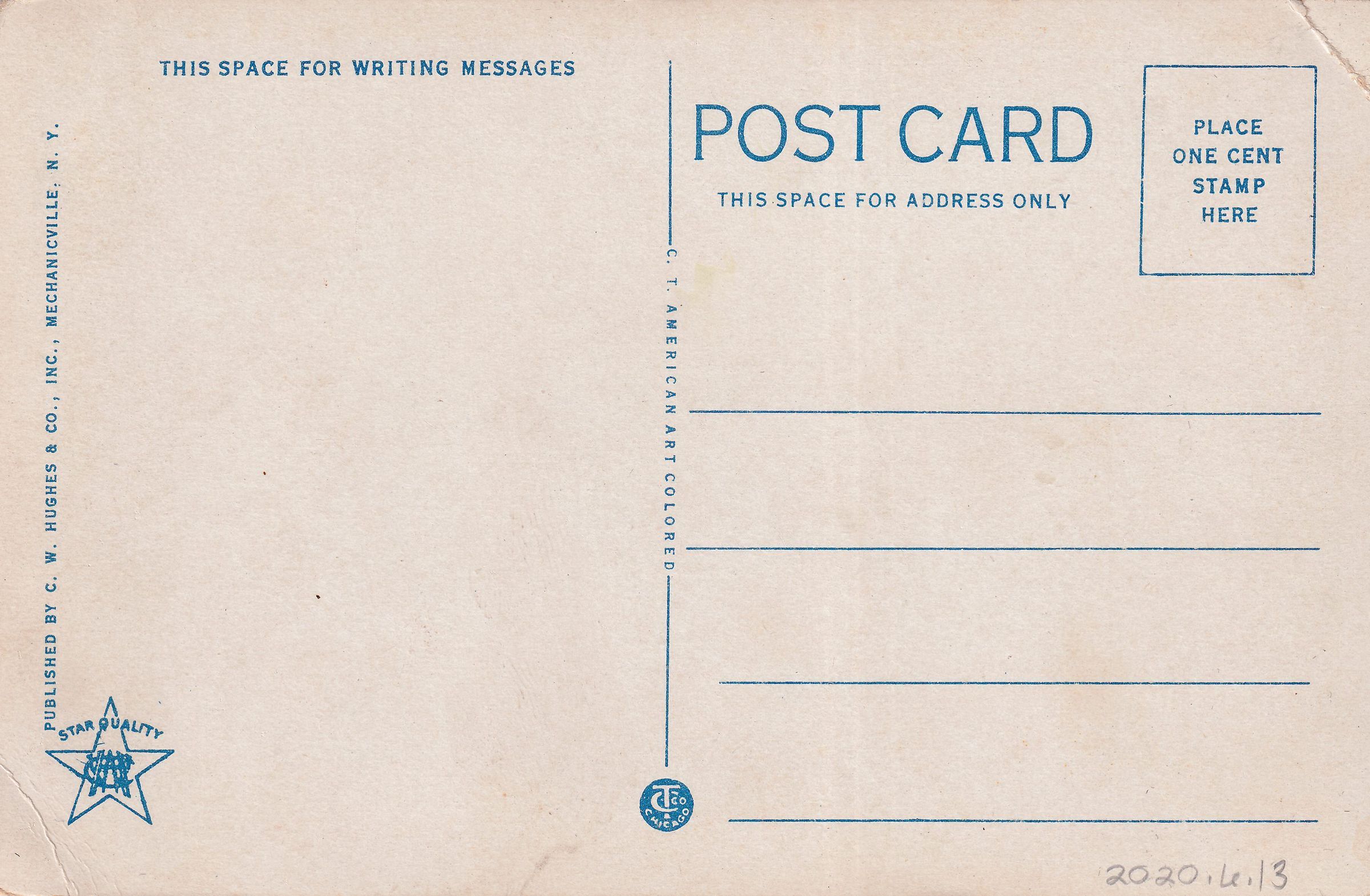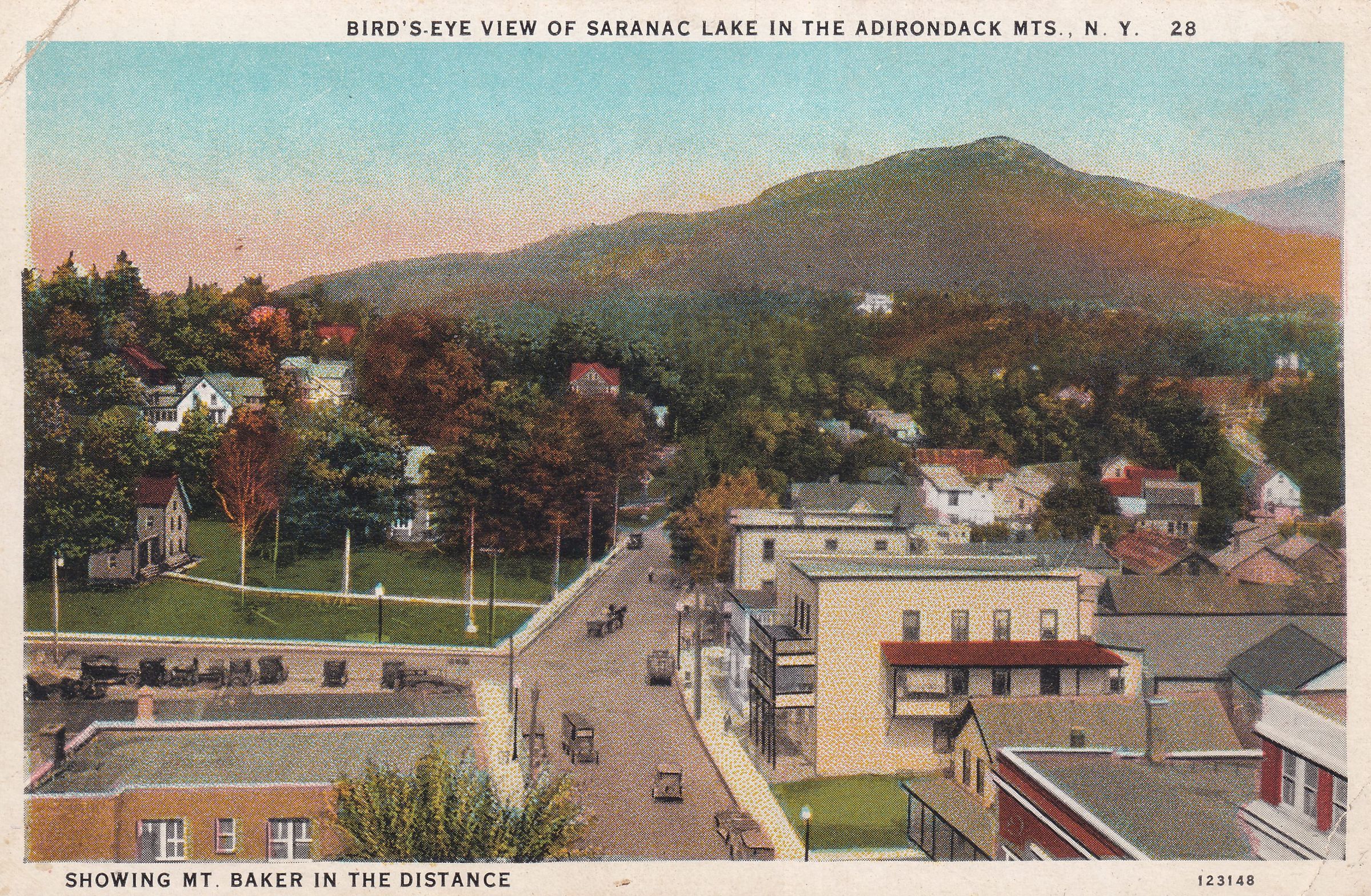Color postcard showing elevated view looking northwest along Bloomingdale Avenue from Broadway. Most likely taken from the Alpine Hotel. 1920s-1930s style cars are visible on the road and Mt. Baker can be seen in the distance. Printed caption on front reads "Bird's-eye view of Saranac Lake in the Adirondack Mts., N.Y. - Showing Mt. Baker in the Distance." Unused, divided back, white border. Printed by C. W. Hughes & Co., Inc., Mechanicville, NY.Subject Place