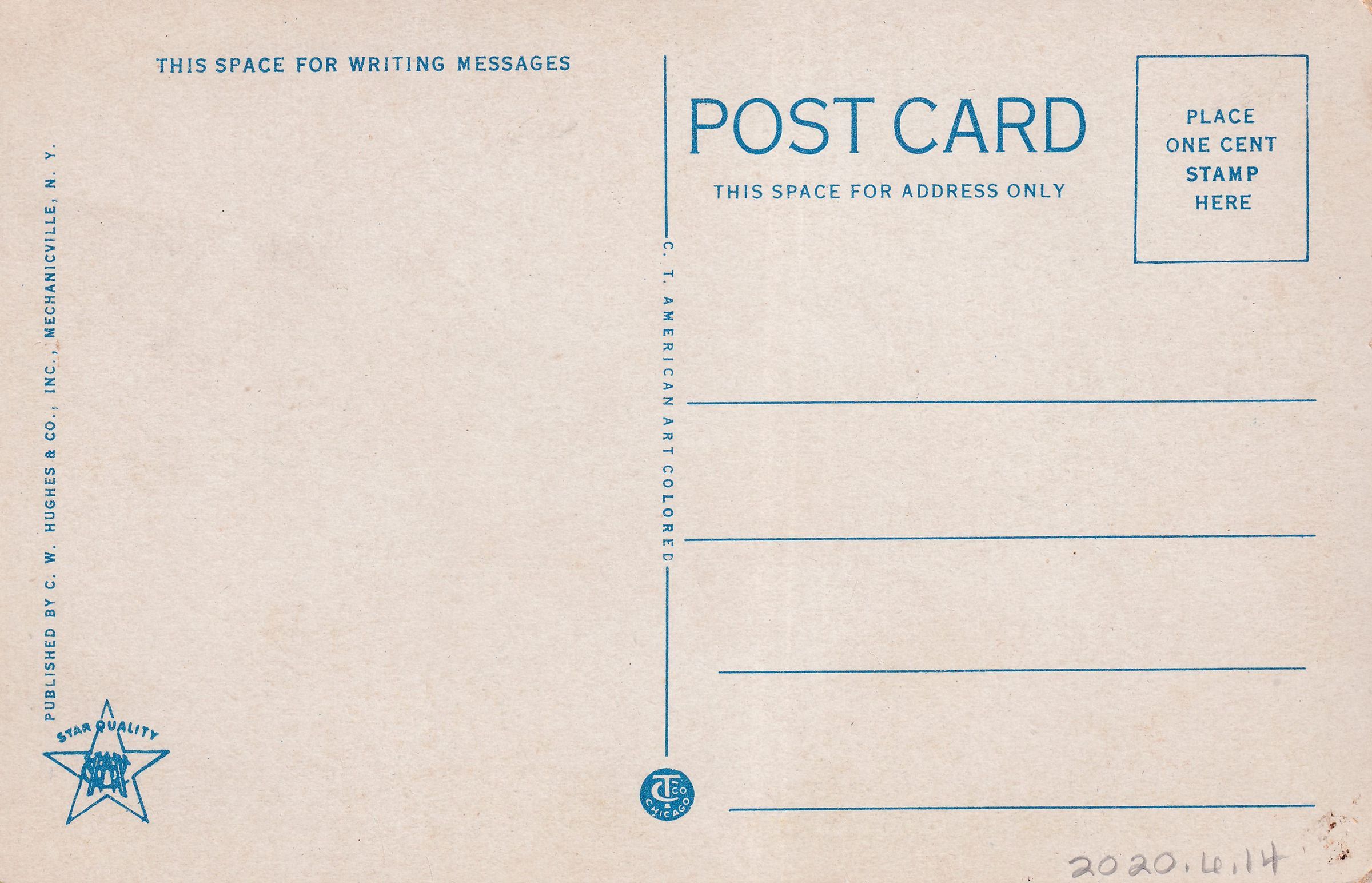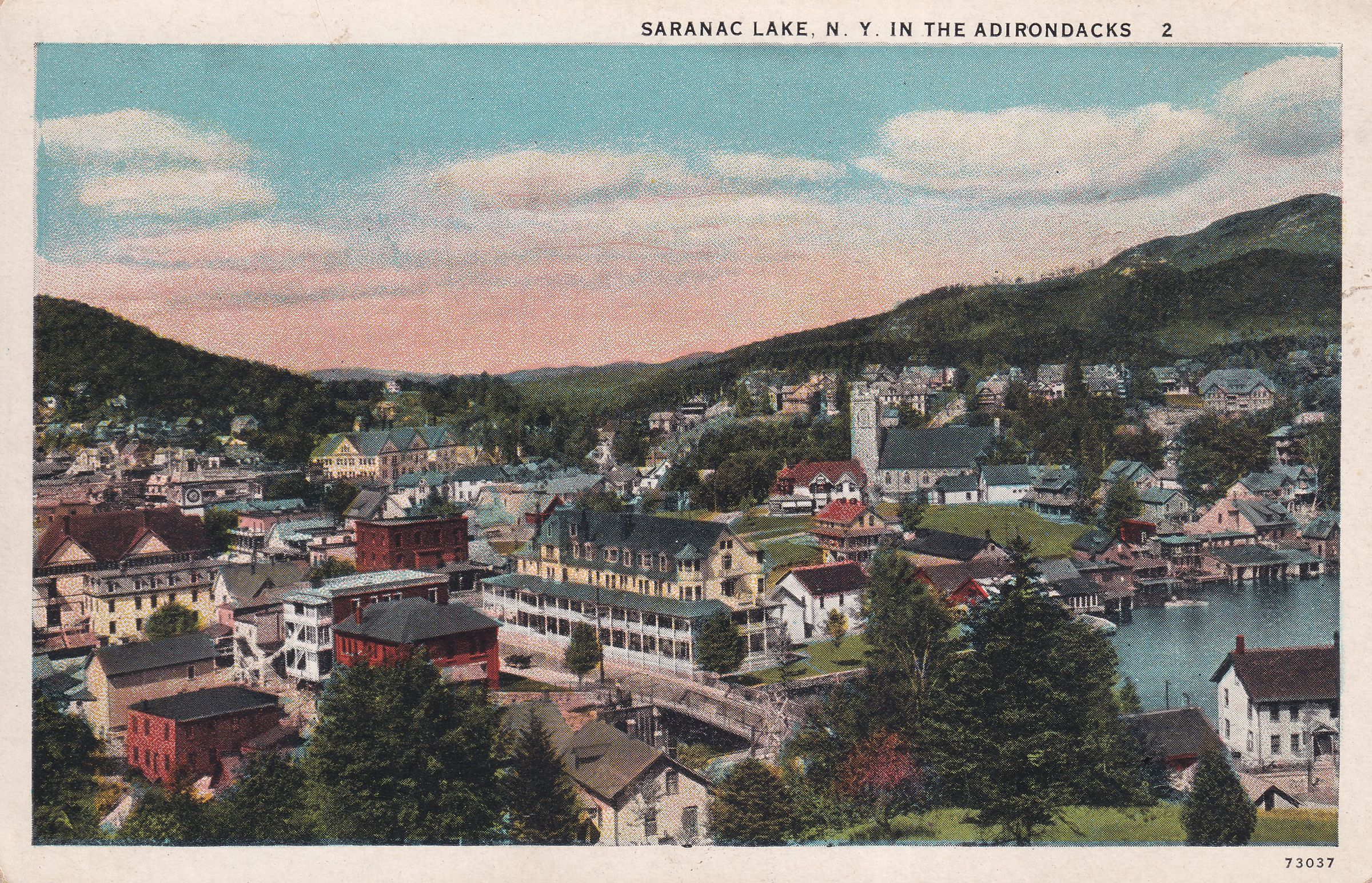 Color postcard showing elevated view of the village of Saranac Lake, looking north from Blood Hill. The original Harrietstown Town Hall, Riverside Inn, Spaulding Block, the original Saranac Lake High School, and the second St. Bernard's Church are visible. Printed caption on the front reads, "Saranac Lake, N. Y. in the Adirondacks." Unused, divided back, white border. Printed by the C. W. Hughes Co., Inc., Mechanicville, NY.Subject Place