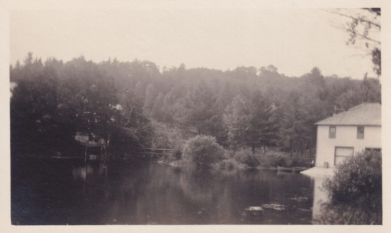 Black-and-White photograph of a boathouse on the edge of the water at Bartlett Carry Club.