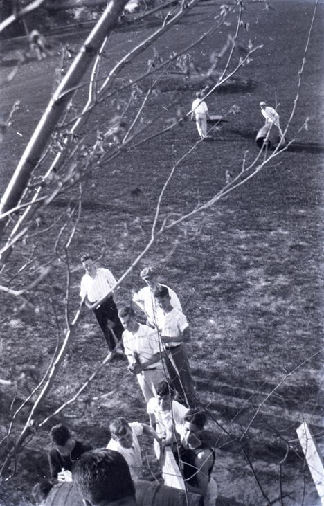 Negative of a group of unidentified young men moving wood across a lawn/field. A number of people at the bottom of the frame are grabbing a large plank, while some in the field are moving a barrel and wheelbarrow. Most likely taken by Mary Ives Baldwin. This item is not fully cataloged but has been uploaded so the image is publicly available; if you would like us to prioritize cataloging this item, please contact the HSL Collections team.