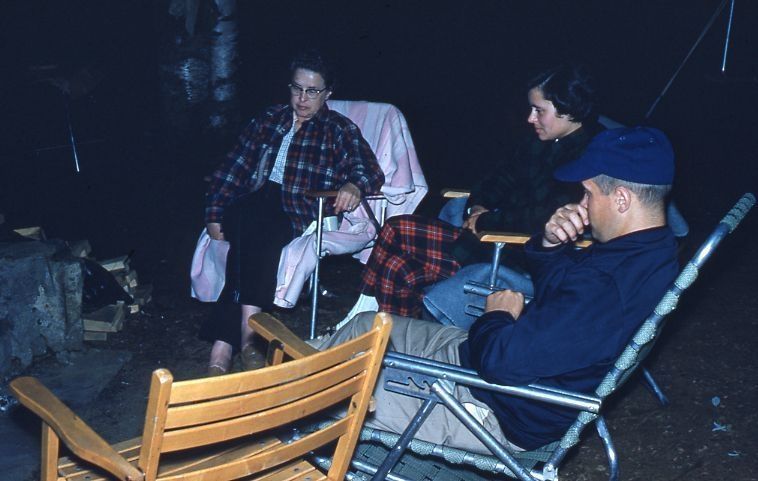 Color Kodachrome slide showing three people sitting in camp chairs. This item is not fully cataloged but has been uploaded so the image is publicly available; if you would like us to prioritize cataloging this item, please contact the HSL Collections team.