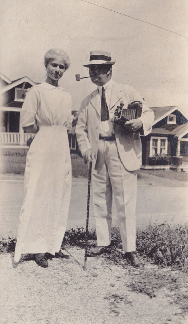Black-and-white photograph of a man and woman standing together near a road with a line of houses on the other side. The man has a pipe in his mouth and is holding a camera.