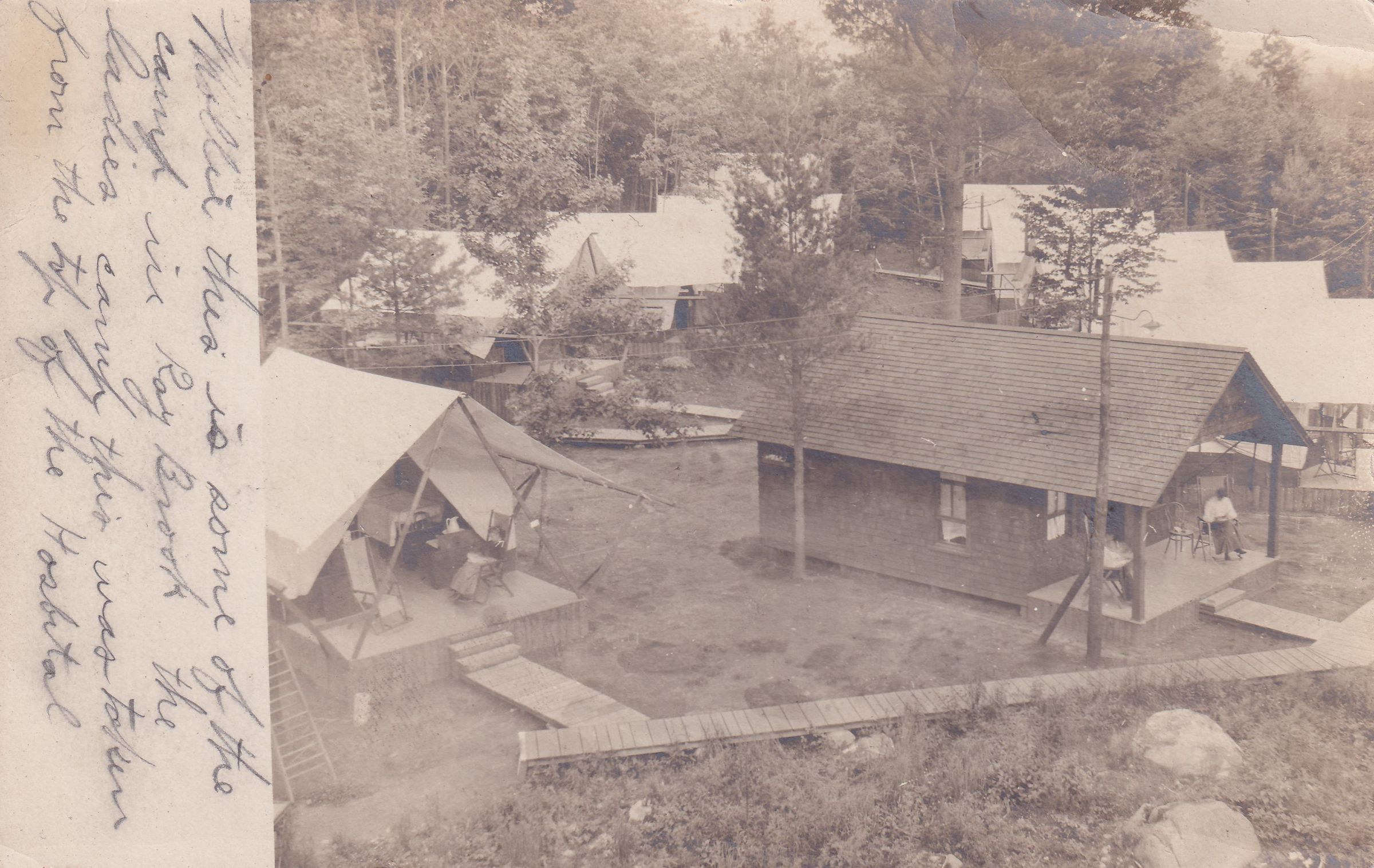 Photograph postcard showing an elevated view of a group of platform tents clustered around a small building with a porch. Women can be seen sitting out on several of the porches. No photographer’s mark. Used, undivided back, white space at left for message, not postmarked. Handwritten message on front reads, “Mollie this is some of the camp in Ray Brook the ladies camp this was taken from the top of the Hospital.” Mailed to Miss Mollie Wands, 207 State St., Schenectady, N. Y.Subject Place
