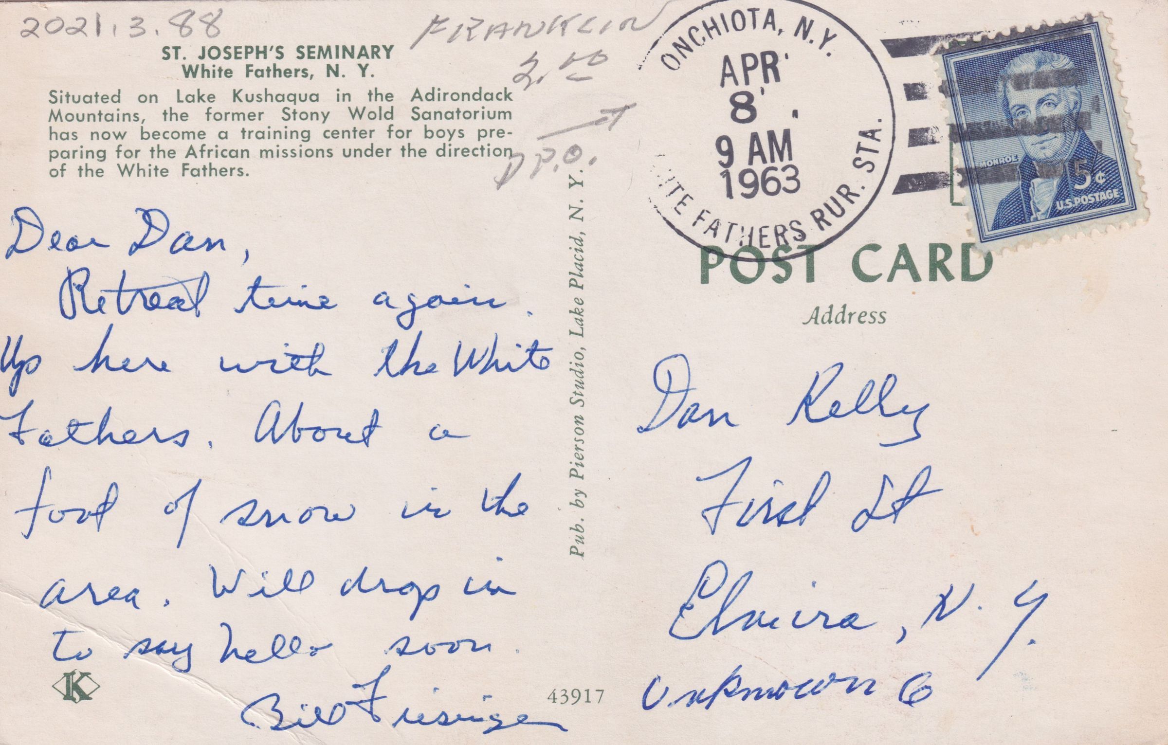 Color postcard showing St. Joseph's Seminary in White Fathers, NY, formerly Stony Wold Sanatorium. Printed caption reads, "St. Joseph's Seminary, White Fathers, N.Y. Situated on Lake Kushaqua in the Adirondack Mountains, the former Stony Wold Sanatorium has now become a training center for boys preparing for the African missions under the direction of the White Fathers." Used, divided back, postmarked Onchiota, NY, White Fathers Rural Station, April 8, 1963. Printed by Pierson Studio, Lake Placid, NY. Handwritten message on reverse reads, "Dear Dan, Retreat time again. Up here with the White Fathers. About a foot of snow in the area. Will drop in to say hello soon. Bill." Mailed to Dan Kelly, First St. Elmira, NY, Unknown Co.Subject Place