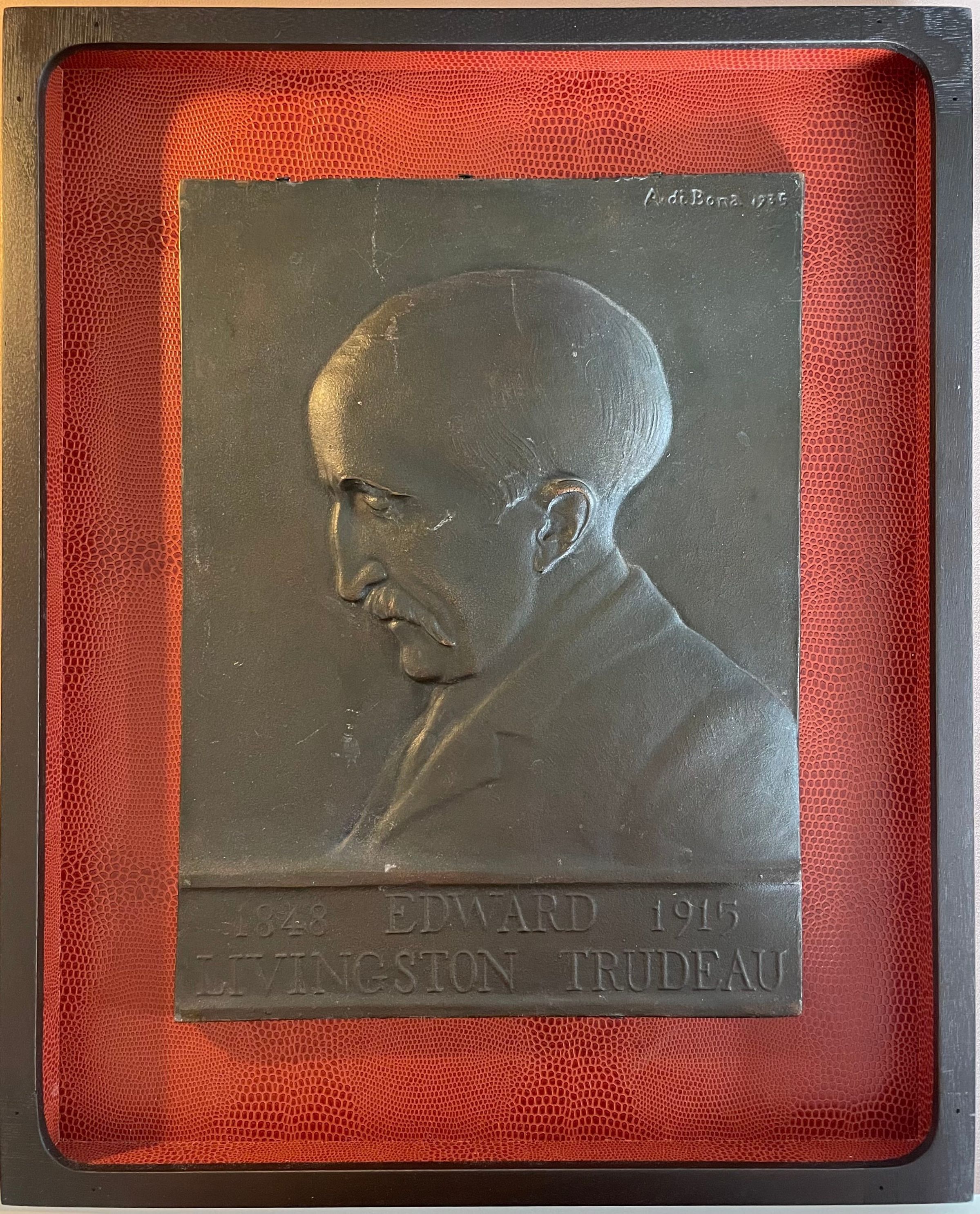Framed bronze bas-relief sculpture of Dr. Edward Livingston Trudeau in profile, by Anthony di Bona. Raised lettering at bottom of work reads, "Edward Livingston Trudeau, 1848-1915." Signature reads, "A. di Bona 1935." Framed in wooden shadow frame with red textured leather backing.