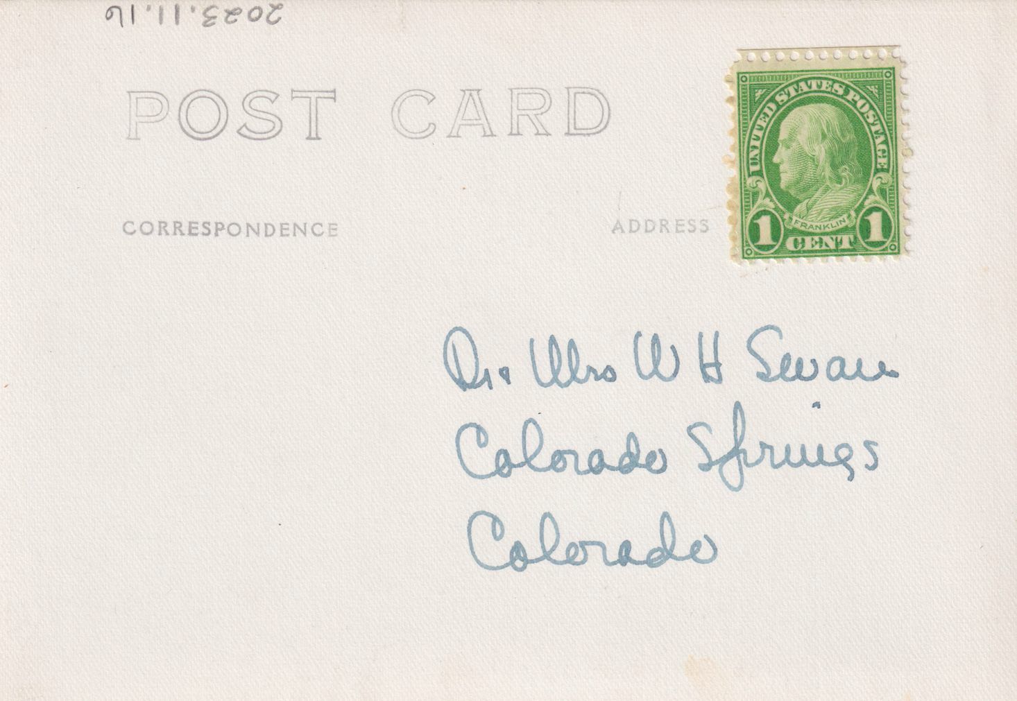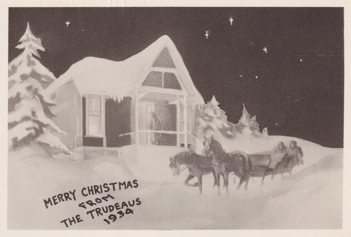Trudeau Family Christmas card, 1934. Features drawing of Little Red in the snow, with a horse-drawn sleigh out front. A person in a fur coat can be seen on the porch. Reads, “Merry Christmas from the Trudeaus, 1934,” on front. [Note: this design mimics the Christmas Seal featuring Little Red released the same year in honor of the 50th Anniversary of Trudeau Sanatorium.] Mailed to Dr. and Mrs. W. H. Swan, Colorado Springs, CO.Subject Place