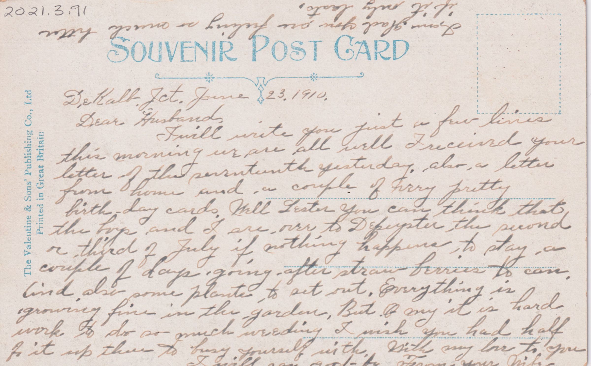 Color postcard showing the Riverside Inn across the Saranac River, looking to the northeast. The original Harrietstown Town Hall and other buildings are visible around it. Printed caption on the front reads, "Riverside Inn from River, Saranac Lake, N.Y." Used, divided back, not mailed. Printed by the Valentine & Sons' Publishing Co., Ltd. Handwritten message across the entire back of the card reads, "DeKalb Junction, June 23, 1910. Dear Husband, I will write you just a few lines this morning. We are all well. I received your letter of the seventeenth yesterday, also a letter from home and a couple of very pretty birthday cards. Well Lester, you can think that the boys and I are over to Depeyster the second or third of July, if nothing happens, to stay a couple of days, going after strawberries to can. And, also some plants to set out. Everything is growing fine in the garden, but oh my it is hard work to do so much weeding. I wish you had half of it up there to busy yourself with. With my love to you I will say good-by. From Your Wife. I am glad you are feeling so much better if it only lasts."Subject Place