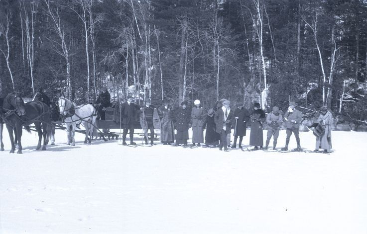 Negative of a large group of unidentified people, most of which are wearing skis or snowshoes. They are standing on a snow-covered frozen lake. Next to the group is a horse drawn sleigh with four horses. Most likely taken by Mary Ives Baldwin. This item is not fully cataloged but has been uploaded so the image is publicly available; if you would like us to prioritize cataloging this item, please contact the HSL Collections team.