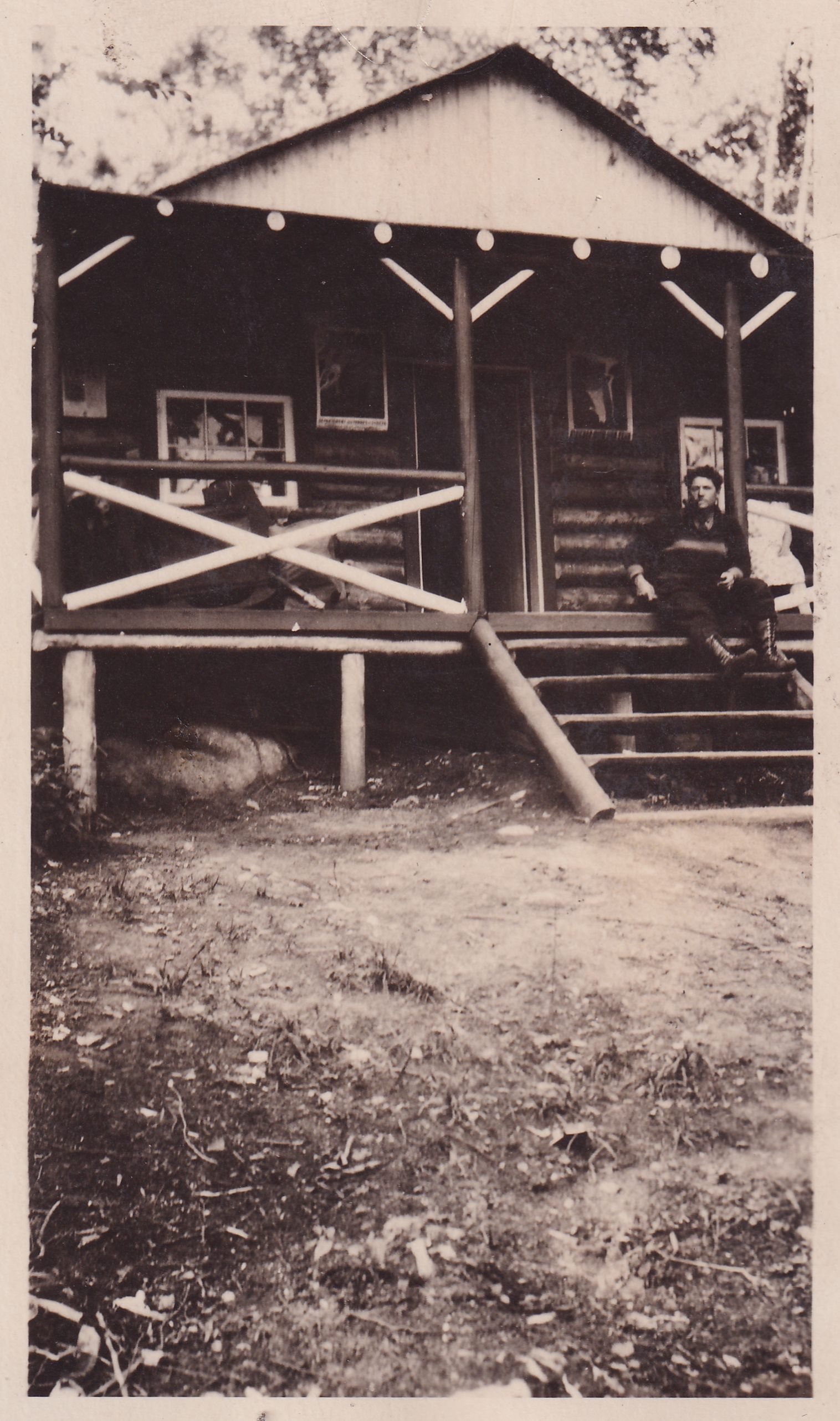 Black-and-White photograph of an unidentified camp. Two people can be seen sitting on the porch.