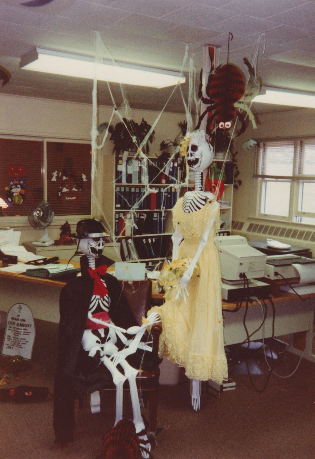 Color photograph of an office decorated for Halloween. There are two skeleton mannequins, one dressed up as a woman and the other as a man. The man skeleton is sitting in a chair with the standing woman skeleton's foot in his lap. There is also a large fake spider. There are also This photograph is from an album of photographs taken at the American Management Association.
