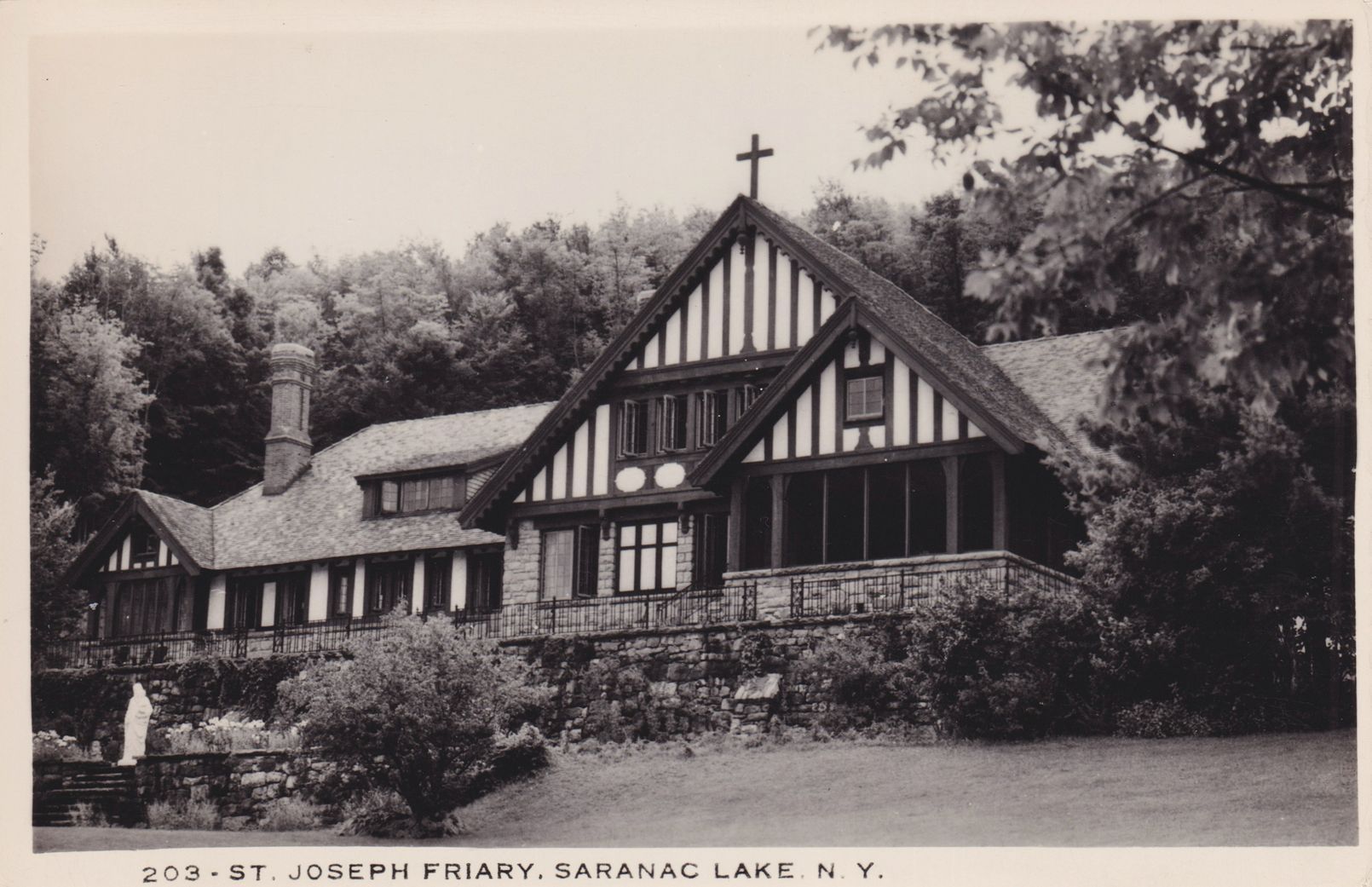 Black-and-White photograph postcard showing the main building at St. Joseph's. Printed caption on front reads, "St. Joseph Friary. Saranac Lake, N. Y." Photograph by Cunningham Studios, Inc., Utica, NY. Unused, divided back, white border.Subject Place