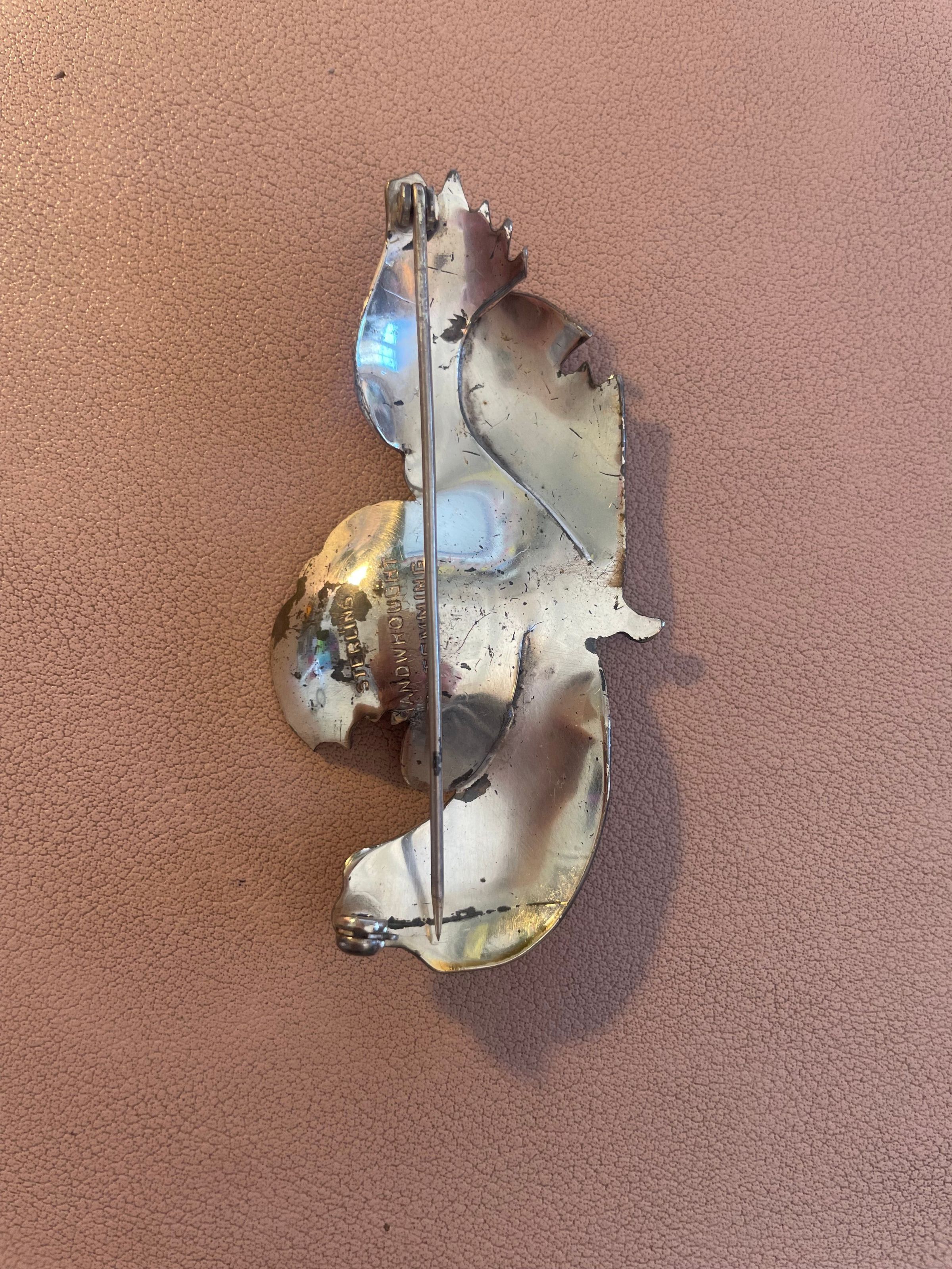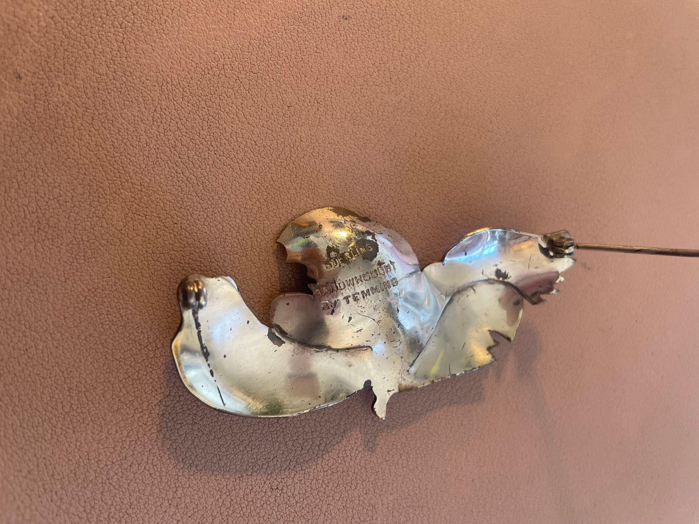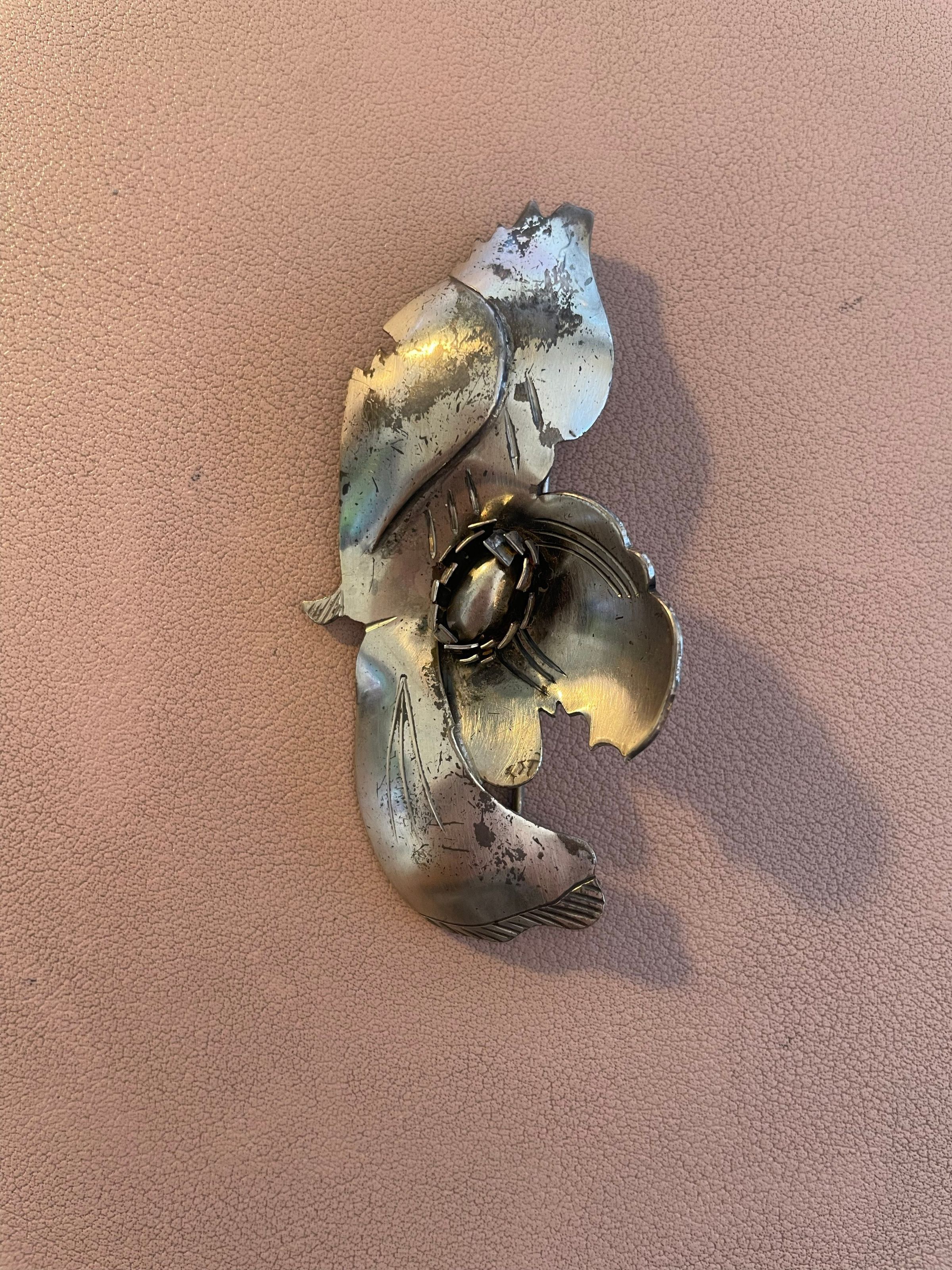 Sterling silver iris pin with bar back. "Sterling. Handwrought by Temming," is stamped on reverse.